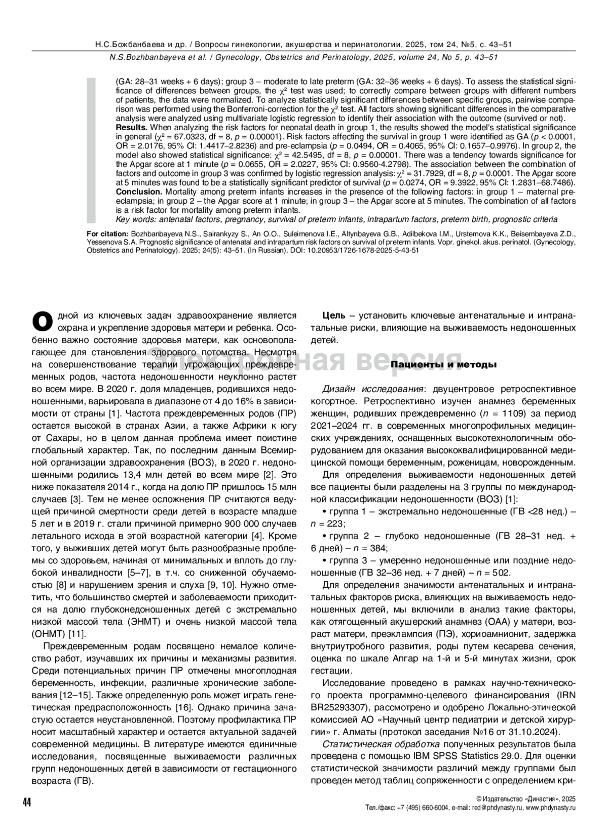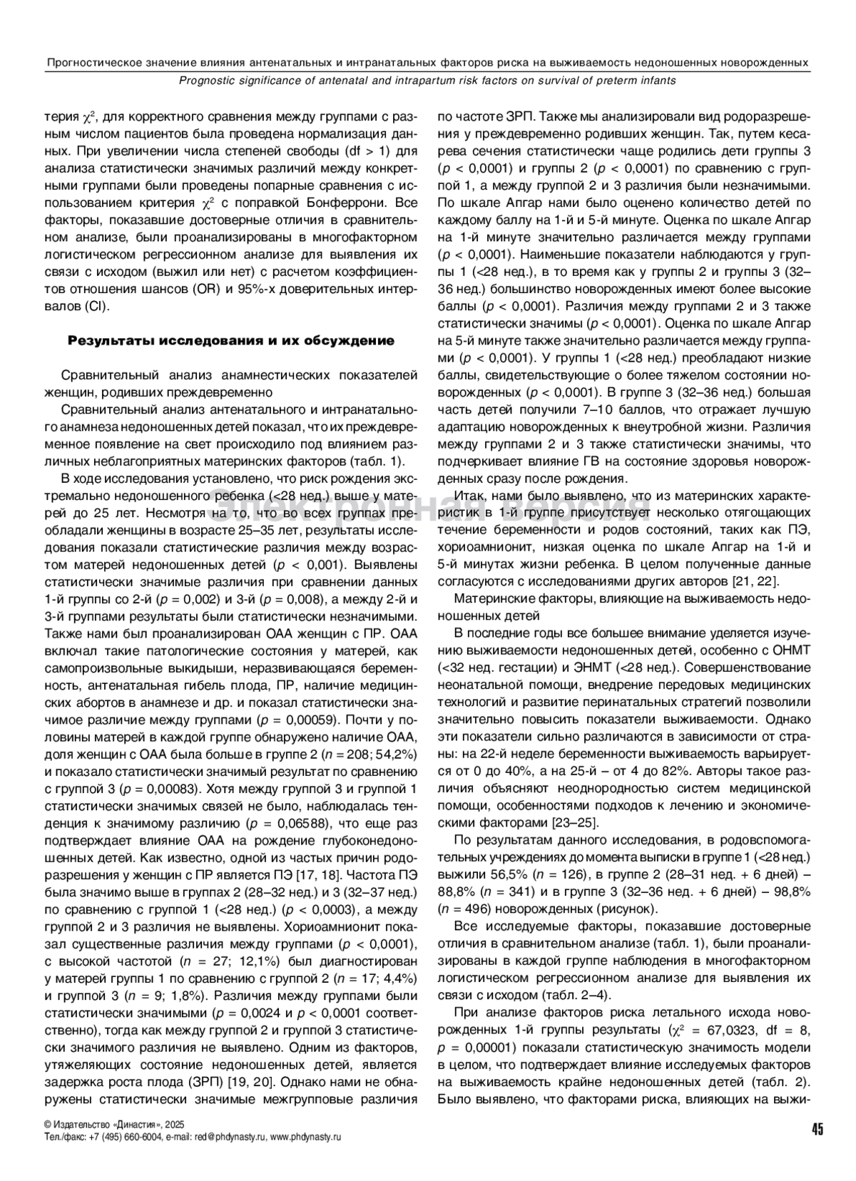 Пациенты и методы. Двуцентровое ретроспективное когортное исследование. Ретроспективный анализ анамнестических данных беременных женщин с преждевременными родами (n = 1109), находившихся в родовспомогательных учреждениях в период 2021–2024 гг. Все пациенты были разделены на 3 группы: группа 1 – экстремально недоношенные (гестационный возраст (ГВ) <28 нед.); группа 2 – глубоко недоношенные (ГВ 28–31 нед. + 6 дней); группа 3 – умеренно недоношенные или поздние недоношенные (ГВ 32–36 нед. + 6 дней). Для оценки статистической значимости различий между группами использовали критерий χ2, для корректного сравнения между группами с разным числом пациентов была проведена нормализация данных. Для анализа статистически значимых различий между конкретными группами были проведены попарные сравнения с использованием критерия χ2 с поправкой Бонферрони. Все факторы, показавшие достоверные отличия в сравнительном анализе, были проанализированы в многофакторном логистическом регрессионном анализе для выявления их связи с исходом (выжил или нет).