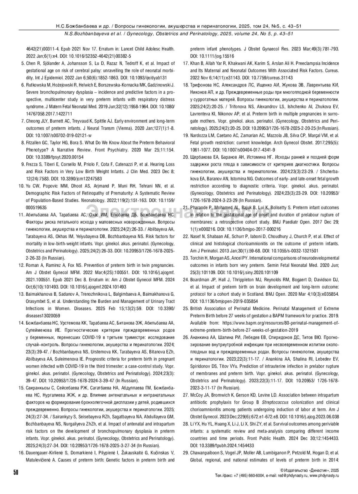 15. Саиранкызы С, Сейсебаева РЖ, Сагатбаева НА, Абдуллаева ГМ, Божбанбаева НС, Нургалиева ЖЖ, и др. Влияние антенатальных и интранатальных факторов на формирование бронхолегочной дисплазии у детей, родившихся преждевременно. Вопросы гинекологии, акушерства и перинатологии. 2025; 24(3):27-34. DOI: 10.20953/1726-1678-2025-3-27-34