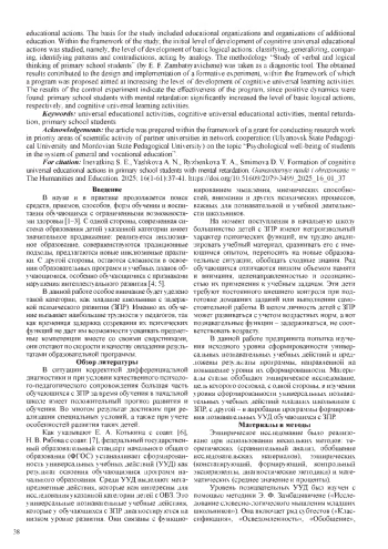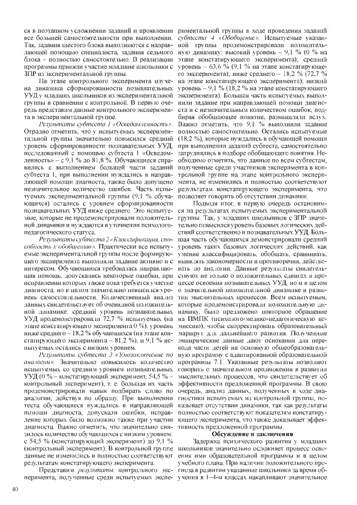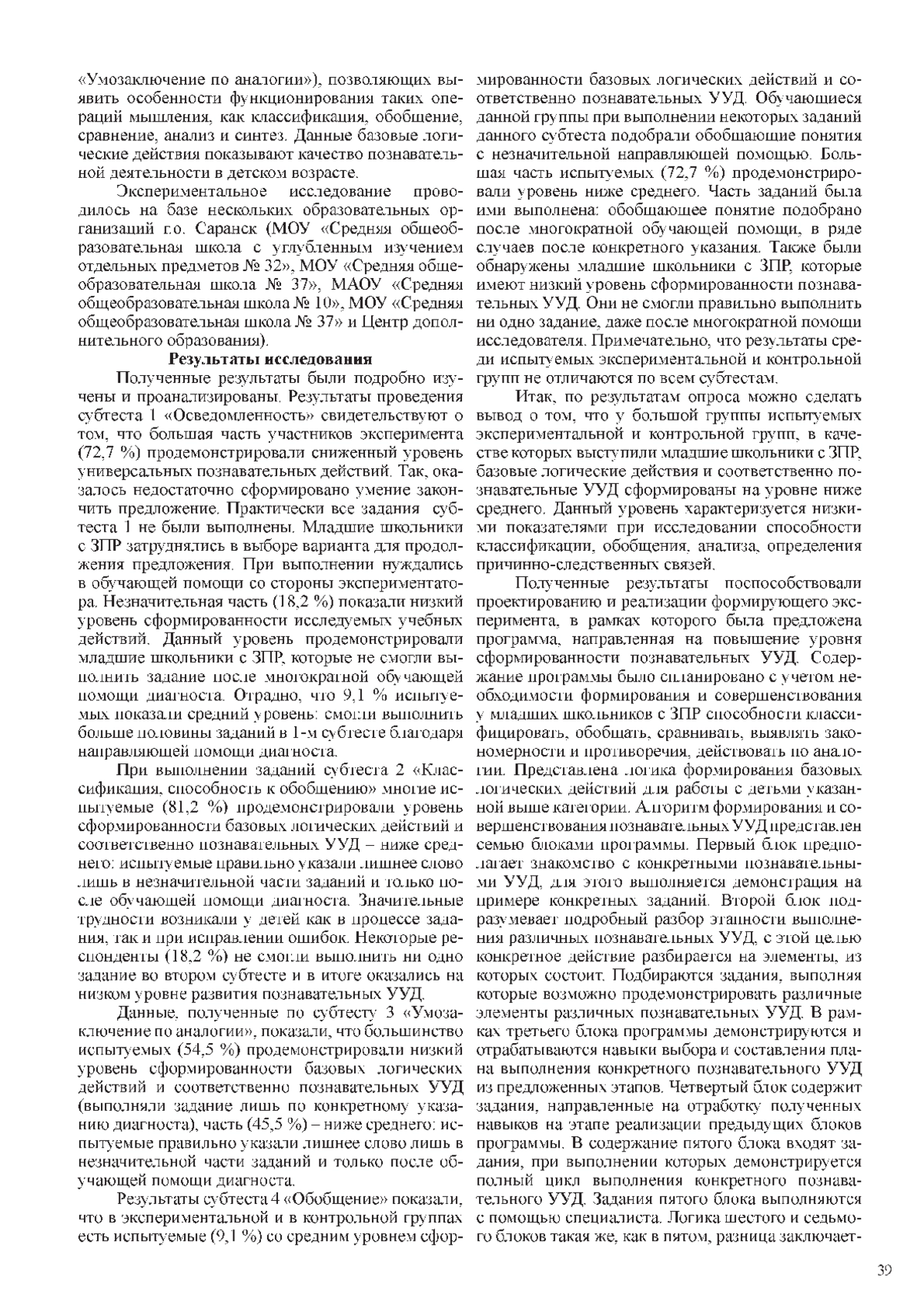 Цель работы: изучить уровень сформированности универсальных познавательных учебных действий у младших школьников с задержкой психического развития и апробировать программу формирования указанных учебных действий. Базой для исследования стали образовательные организации и организации дополнительного образования. В рамках исследования изучен исходный уровень сформированности познавательных универсальных учебных действий - уровень базовых логических действий: классифицировать, обобщать, сравнивать, выявлять закономерности и противоречия, действовать по аналогии. В качестве диагностического инструментария была взята методика «Исследование словесно-логического мышления младших школьников» (Э. Ф. Замбацявичене). Полученные результаты способствовали проектированию и реализации формирующего эксперимента, в рамках которого предложена программа, направленная на повышение уровня сформированности познавательных УУД. Результаты контрольного эксперимента свидетельствуют об эффективности программы, так как обнаружена положительная динамика: у младших школьников с задержкой психического развития значительно повысился уровень базовых логических действий, соответственно и познавательных УУД.