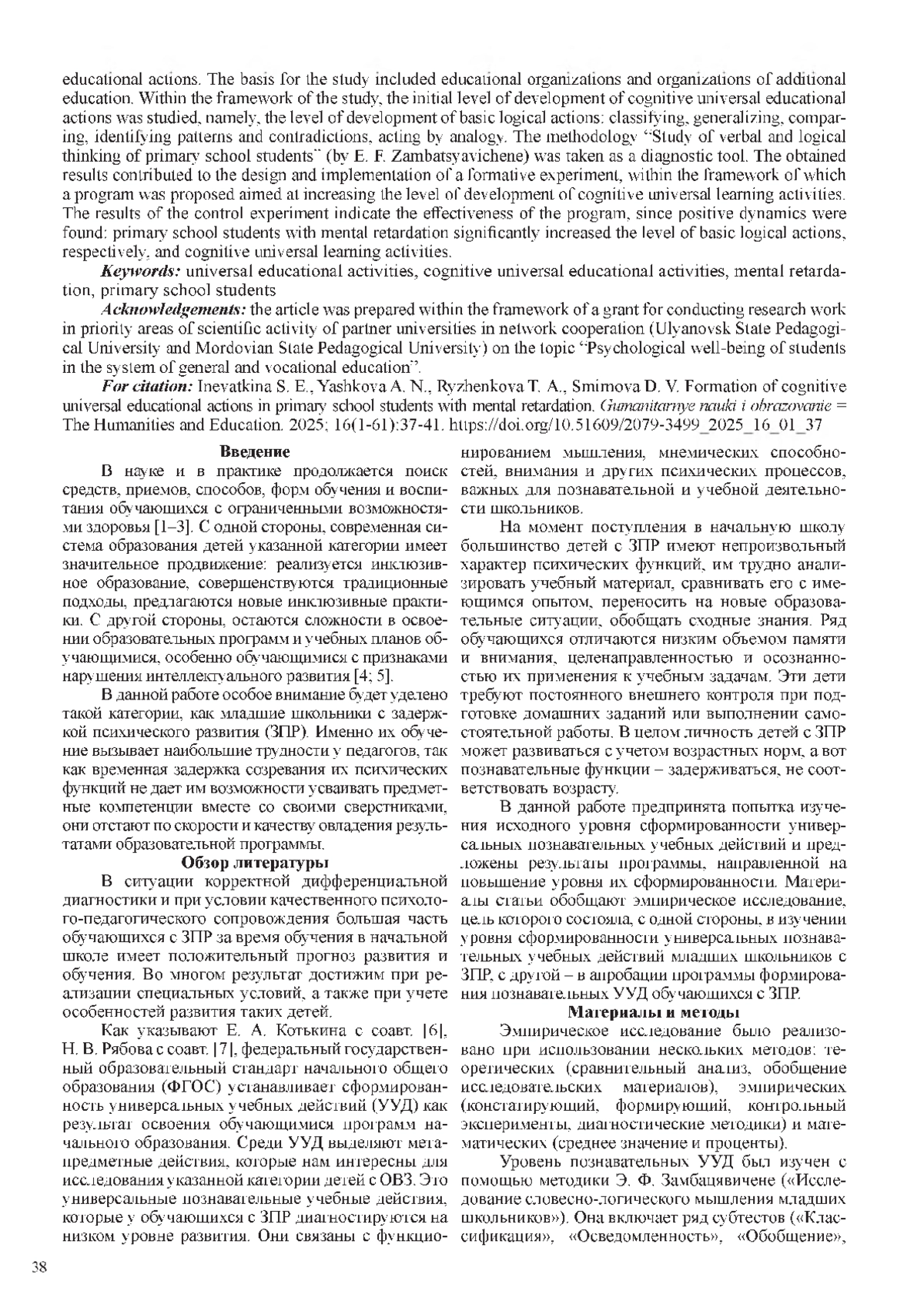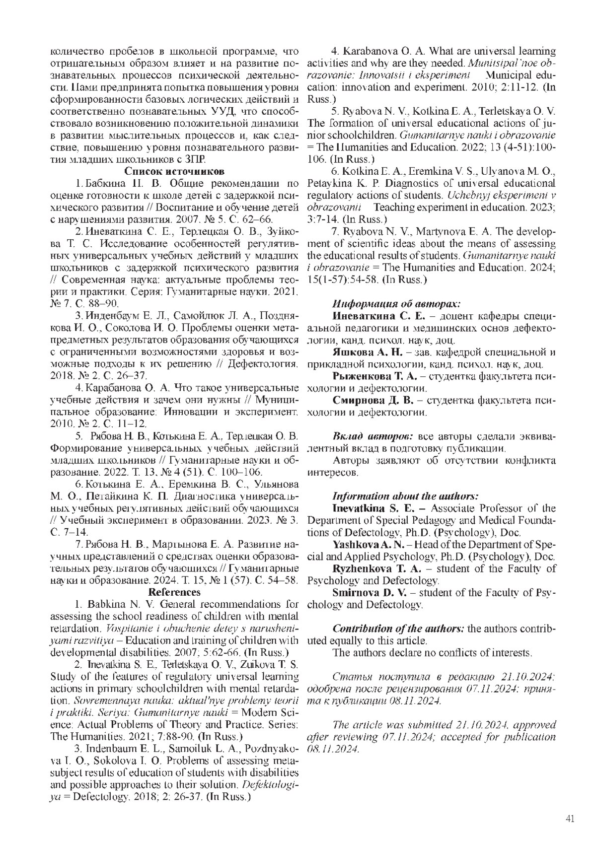 2. Иневаткина С. Е., Терлецкая О. В., Зуйкова Т. С. Исследование особенностей регулятивных универсальных учебных действий у младших школьников с задержкой психического развития // Современная наука: актуальные проблемы теории и практики. Серия: Гуманитарные науки. 2021. № 7. С. 88-90. EDN: ZAAZEQ