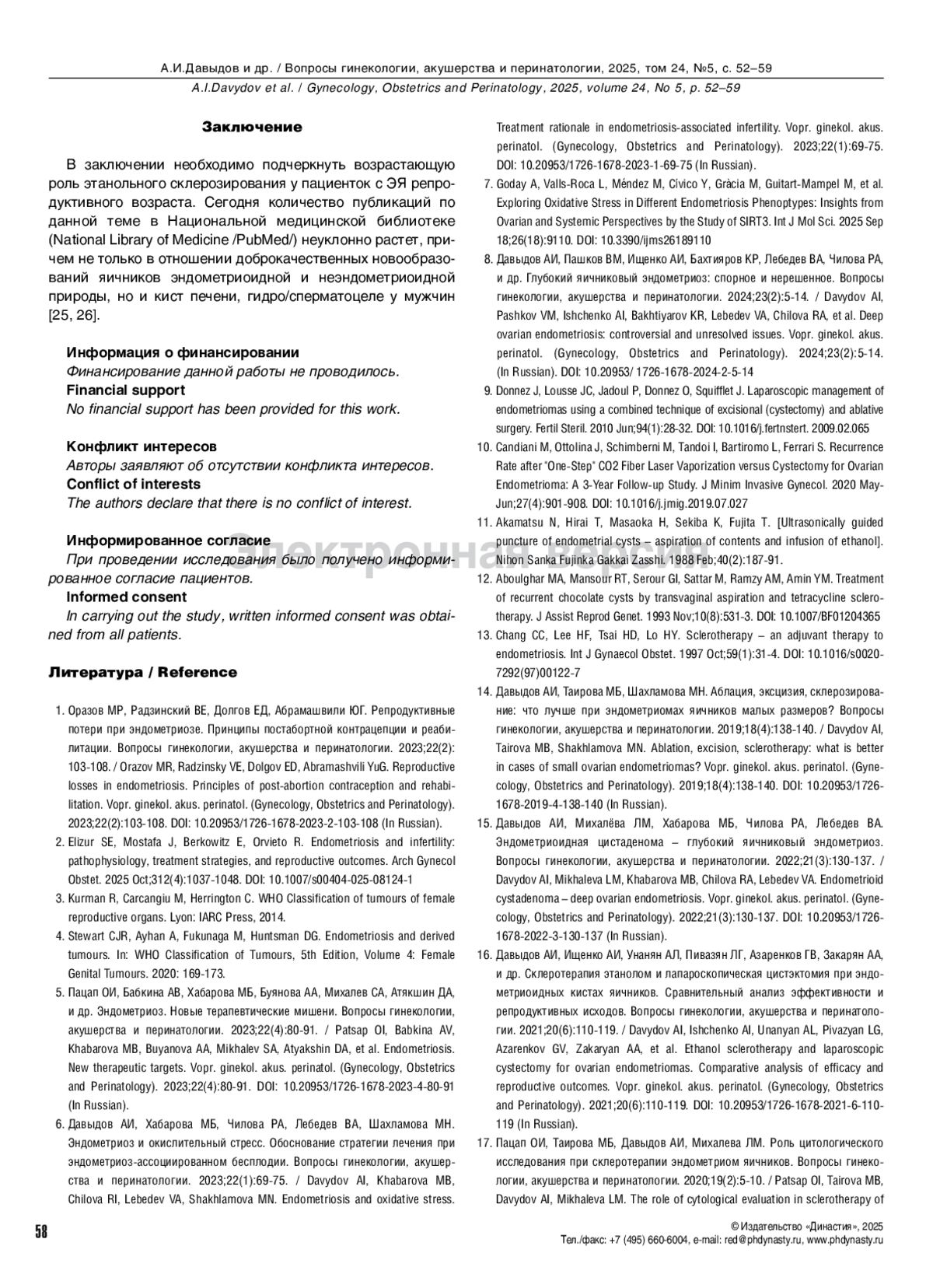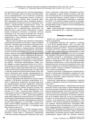 14. Давыдов АИ, Таирова МБ, Шахламова МН. Аблация, эксцизия, склерозирование: что лучше при эндометриомах яичников малых размеров? Вопросы гинекологии, акушерства и перинатологии. 2019;18(4):138-140.kol. akus. perinatol. (Gynecology, Obstetrics and Perinatology). 2019;18(4):138-140. DOI: 10.20953/17261678-2019-4-138-140
