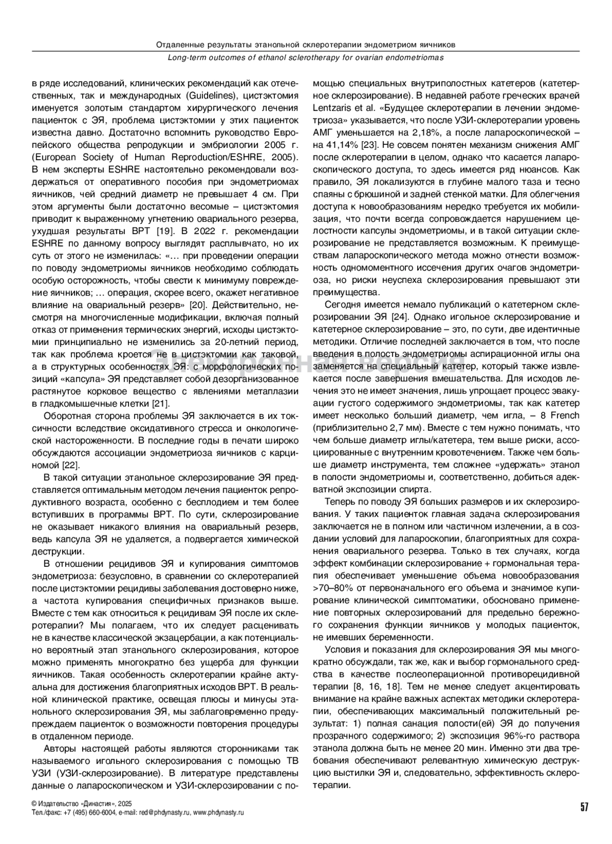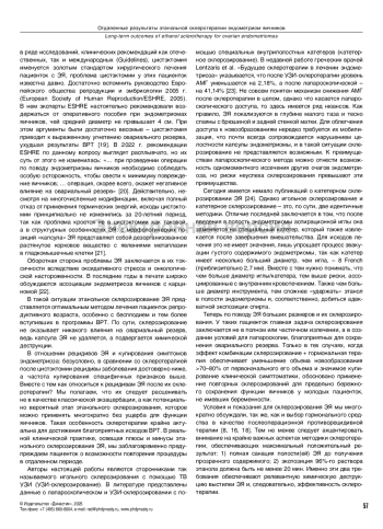Заключение. Этанольное склерозирование ЭЯ представляет оптимальный метод лечения пациенток репродуктивного возраста, особенно со сниженным овариальным резервом, так как не оказывает повреждающего действия на фолликулярный аппарат. Рецидивы ЭЯ после склеротерапии следует расценивать не в качестве классической экзацербации, а как фактор потенциально вероятного этапа склерозирования.