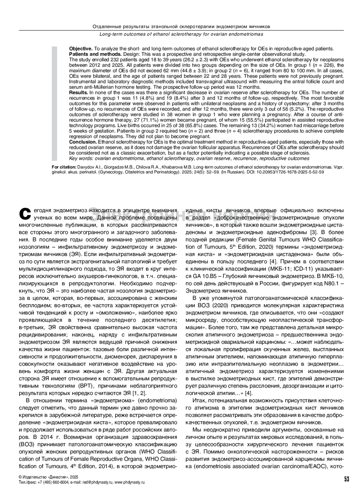 Пациенты и методы. Дизайн: про- и ретроспективное одноцентровое наблюдательное исследование. В исследование включены 232 пациентки в возрасте от 18 до 39 лет (26,2 ± 2,3) с ЭЯ, которым выполнено этанольное склерозирование новообразований в период 2012–2025 гг. В зависимости от величины ЭЯ выделены 2 группы. В 1-й группе (n = 226) максимальный диаметр ЭЯ не превышал 62 мм (44,8 ± 3,9), во 2-й группе (n = 6) – варьировал от 80 до 100 мм, при этом во всех наблюдениях ЭЯ были двусторонними, а возраст пациенток составлял 22–28 лет. Ранее эти пациентки не имели беременностей. Методы инструментальной и лабораторной диагностики включали трансвагинальную эхографию с определением количества антральных фолликулов и тестирование сывороточного антимюллерова гормона. Проспективный период наблюдения составил 12 мес.