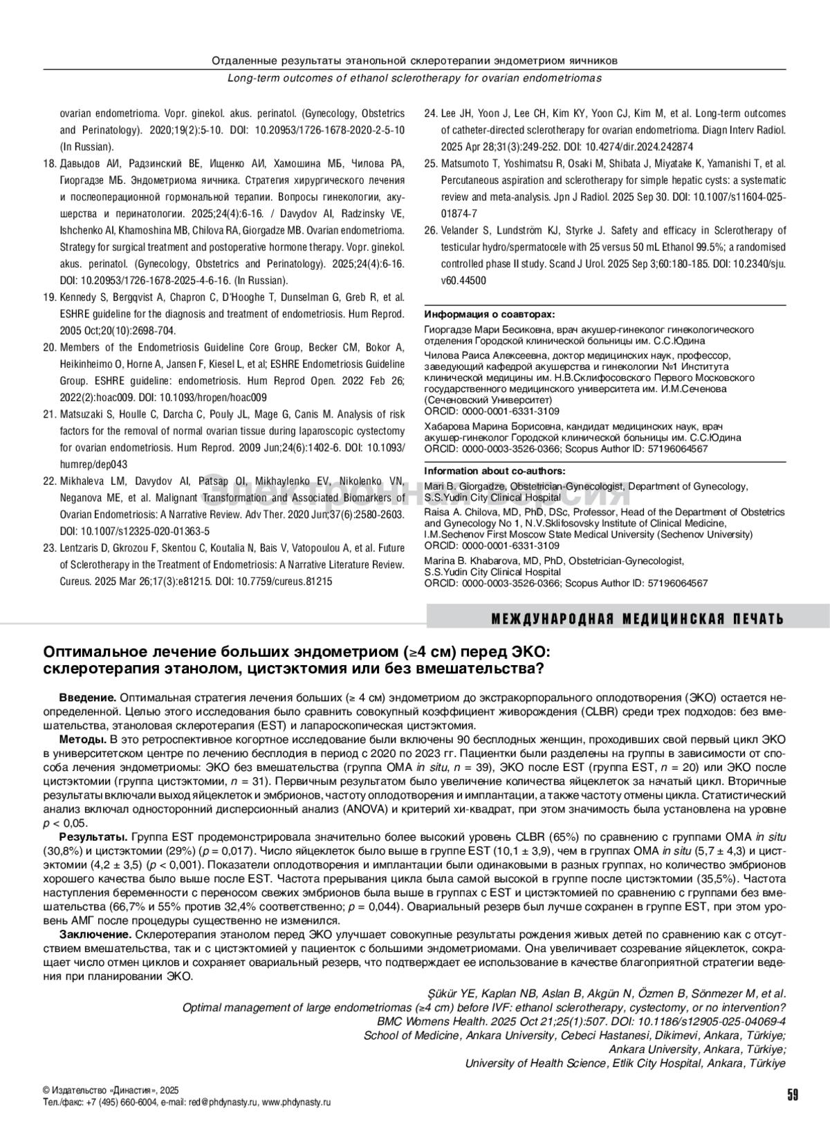 18. Давыдов АИ, Радзинский ВЕ, Ищенко АИ, Хамошина МБ, Чилова РА, Гиоргадзе МБ. Эндометриома яичника. Стратегия хирургического лечения и послеоперационной гормональной терапии. Вопросы гинекологии, акушерства и перинатологии. 2025;24(4):6-16. DOI: 10.20953/1726-1678-2025-4-6-16