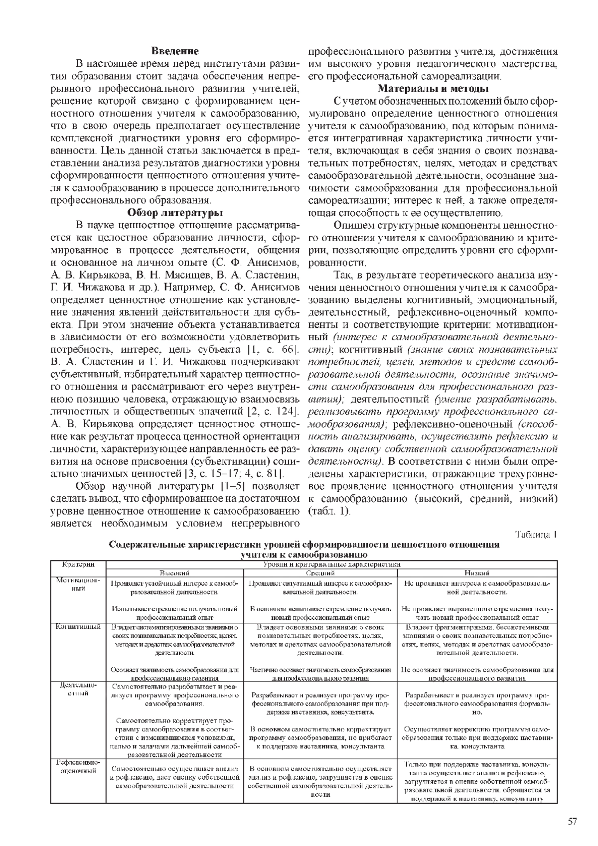 В статье исследуется проблема сформированности ценностного отношения учителя к самообразованию в процессе дополнительного профессионального образования: раскрыто содержание понятия, обозначены критерии сформированности (мотивационный - интерес к самообразовательной деятельности; когнитивный - знание своих познавательных потребностей, целей, методов и средств самообразовательной деятельности, осознание значимости самообразования для профессионального развития; деятельностный -умение разрабатывать, реализовывать программу профессионального самообразования; рефлексивно-оценочный - способность анализировать, осуществлять рефлексию и давать оценку собственной самообразовательной деятельности). В соответствии с каждым из критериев определены характеристики, отражающие трехуровневое проявление ценностного отношения учителя к самообразованию (высокий, средний, низкий). Предложен комплекс методик оценки уровня сформированности ценностного отношения к самообразованию по каждому из критериев, а также представлены результаты исследования. Зафиксировано, что ценностное отношение учителя к самообразованию сформировано в основном на среднем уровне, при этом наиболее высокие показатели получены по когнитивному критерию, наиболее низкие - по мотивационному.