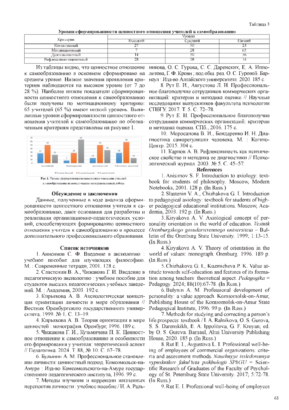 5. Чижакова Г. И., Кузьмичева П. К. Ценностное отношение к самообразованию и особенности его формирования у учителя: теоретический аспект // Педагогика. 2024. Т. 88, № 10. С. 67-78. EDN: UVQUDD