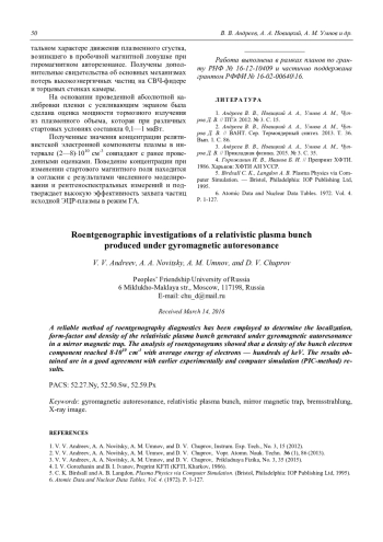 V. V. Andreev, A. A. Novitsky, A. M. Umnov, and D. V. Chuprov Roentgenographic investigations of a relativistic plasma bunch produced under gyromagnetic autoresonance 46