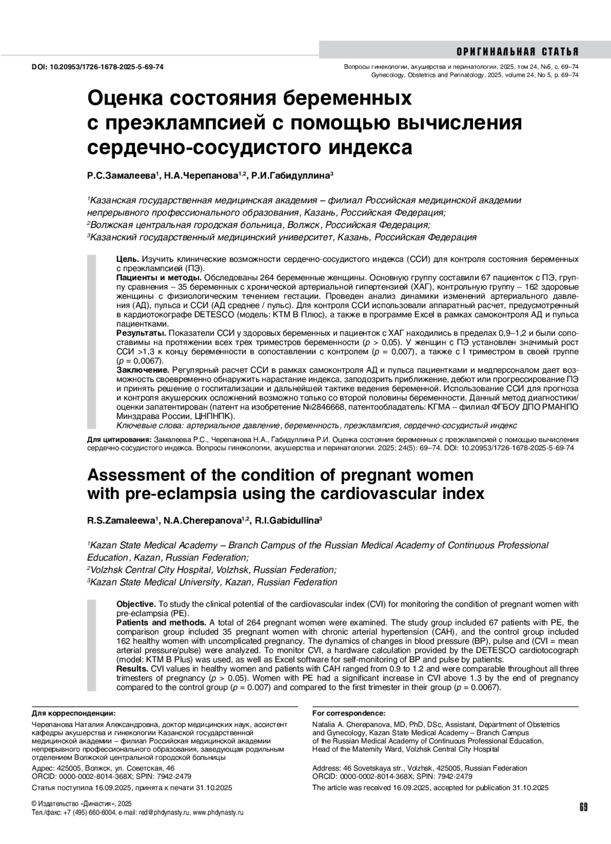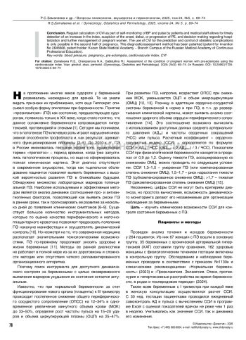 Заключение. Регулярный расчет ССИ в рамках самоконтроля АД и пульса пациентками и медперсоналом дает возможность своевременно обнаружить нарастание индекса, заподозрить приближение, дебют или прогрессирование ПЭ и принять решение о госпитализации и дальнейшей тактике ведения беременной. Использование ССИ для прогноза и контроля акушерских осложнений возможно только со второй половины беременности. Данный метод диагностики/ оценки запатентирован (патент на изобретение №2846668, патентообладатель: КГМА – филиал ФГБОУ ДПО РМАНПО Минздрава России, ЦНПНПК).