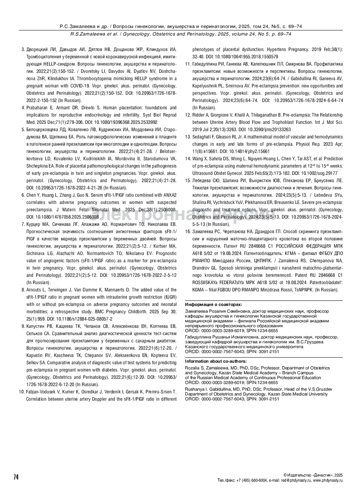 16. Замалеева РС, Черепанова НА, Драндров ГЛ. Способ скрининга преэклампсии и нарушений маточно-плацентарного кровотока во второй половине беременности. Патент RU 2846668 C1 РОССИЙСКАЯ ФЕДЕРАЦИЯ МПК A61B 5/02 от 19.08.2024. Патентообладатель: КГМА - филиал ФГБОУ ДПО РМАНПО Минздрава России, ЦНПНПК.