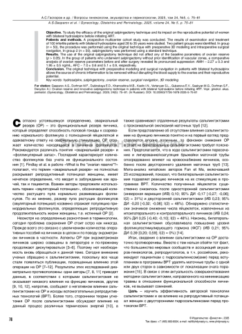 Заключение. Оригинальная методика предоперационного моделирования и хирургической навигации у пациенток с билатеральными гидросальпинксами позволяет удалить источник хронического воспаления, не нарушая кровоснабжение и репродуктивный потенциал яичников.