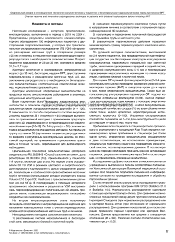 Пациенты и методы. Когортное проспективное многоцентровое исследование. Изучены результаты обследования и лечения 100 инфертильных пациенток с двусторонними гидросальпинксами в возрасте от 28 до 35 лет. Выделены 2 группы пациенток. В 1-й группе (n = 50) операция выполнялась по оригинальной методике с применением предоперационного 3D-моделирования и интраоперационной хирургической навигации. Во 2-й группе (n = 50) сальпингэктомию осуществляли по стандартной методике.