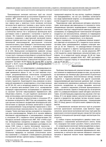 Заключение. Этанольное склерозирование ЭЯ представляет оптимальный метод лечения пациенток репродуктивного возраста, особенно со сниженным овариальным резервом, так как не оказывает повреждающего действия на фолликулярный аппарат. Рецидивы ЭЯ после склеротерапии следует расценивать не в качестве классической экзацербации, а как фактор потенциально вероятного этапа склерозирования.