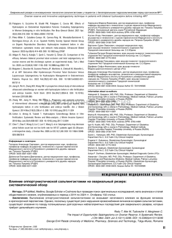 26. Cohen A., Almog B., Tulandi T. Hydrosalpinx Sclerotherapy Before In Vitro Fertilization: Systematic Review and Meta-analysis. J Minim Invasive Gynecol. 2018 May-Jun;25(4):600-607. DOI: 10.1016/j.jmig.2017.12.004