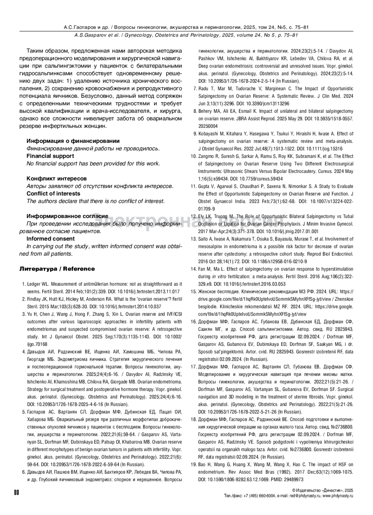 18. Дорфман МФ, Гаспаров АС, Радзинский ВЕ. Способ подготовки и выполнения хирургической операции на органах малого таза. Автор. cвид. №2736800. Госреестр изобретений РФ, дата регистрации 02.09.2024.