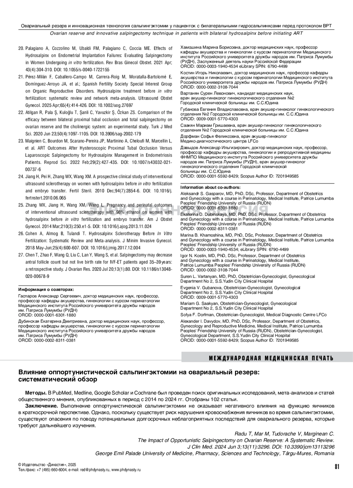 7. Radu T, Mar M, Tudorache V, Marginean C. The Impact of Opportunistic Salpingectomy on Ovarian Reserve: A Systematic Review. J Clin Med. 2024 Jun 3;13(11):3296. DOI: 10.3390/jcm13113296