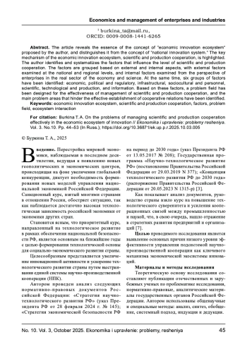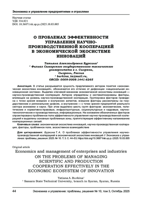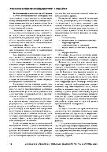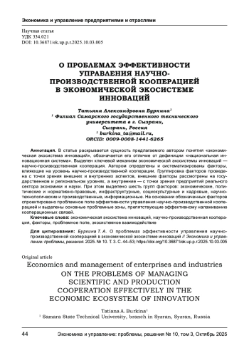 В статье раскрывается сущность предлагаемого автором понятия «экономическая экосистема инноваций», обозначается его отличие от дефиниции «национальная инновационная система». Выделен ключевой механизм экономической экосистемы инноваций - научно-производственная кооперация. Автором определены и систематизированы факторы, влияющие на уровень научно-производственной кооперации. Группировка факторов проведена с точки зрения внешних и внутренних аспектов, внешние факторы рассмотрены на государственном и региональном уровнях, а внутренние - с точки зрения предприятий реального сектора экономики и науки. При этом выделено шесть групп факторов: экономические, политические и нормативно-правовые, инфраструктурные, социокультурные и кадровые, научно-технологические и производственные, информационные. На основании обозначенных факторов спроектировано проблемное поле эффективности управления научно-производственной кооперацией и выделены основные проблемные зоны, препятствующие эффективному налаживанию кооперационных связей.