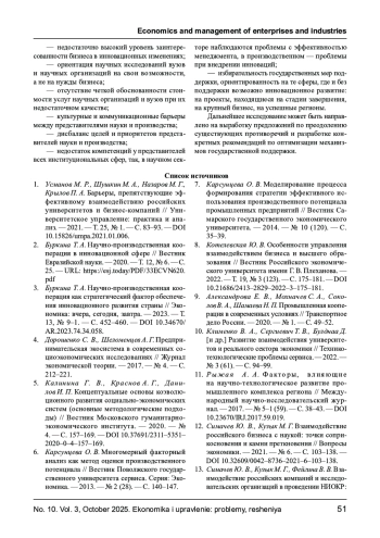 1. Усманов М. Р., Шушкин М. А., Назаров М. Г., Крылов П. А. Барьеры, препятствующие эффективному взаимодействию российских университетов и бизнес- компаний // Университетское управление: практика и анализ. - 2021. - Т. 25, № 1. - С. 83-93. DOI: 10.15826/umpa.2021.01.006 EDN: GUTSJZ