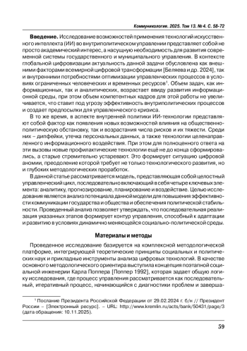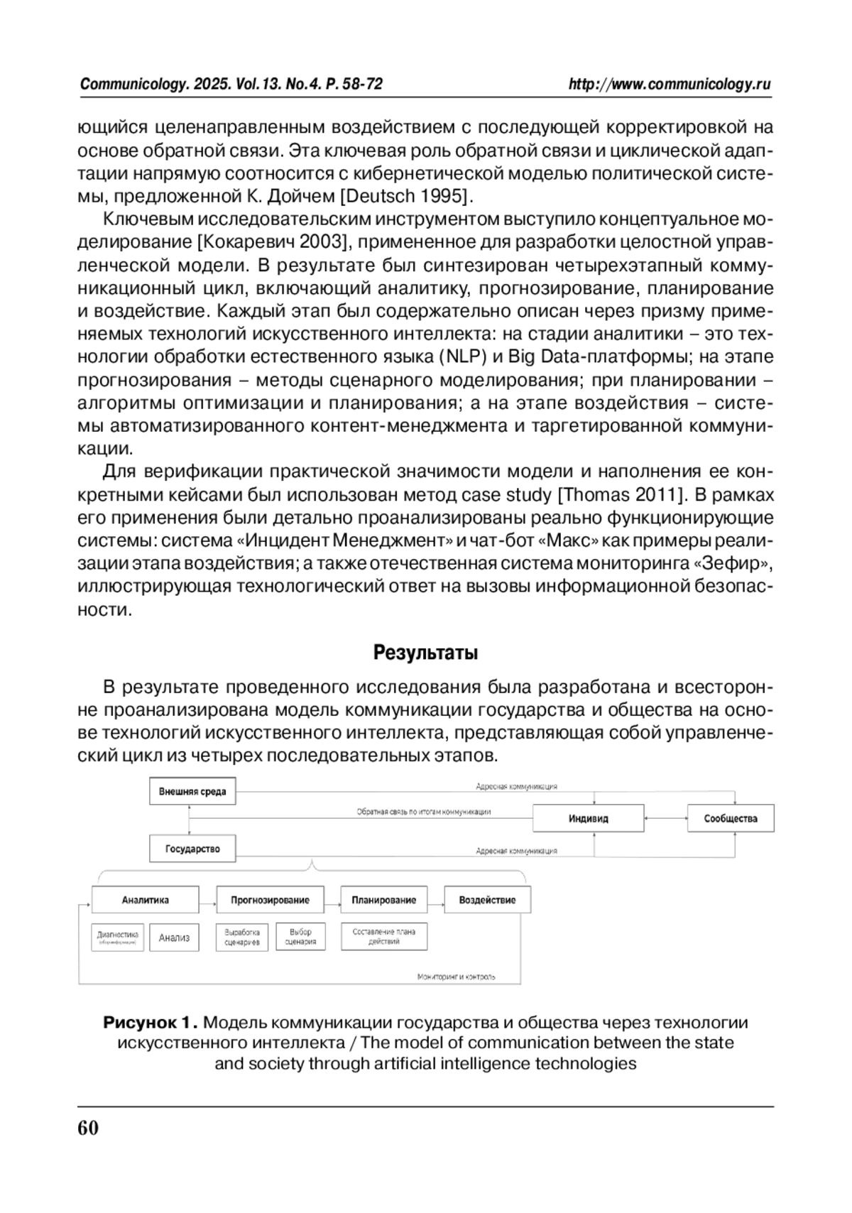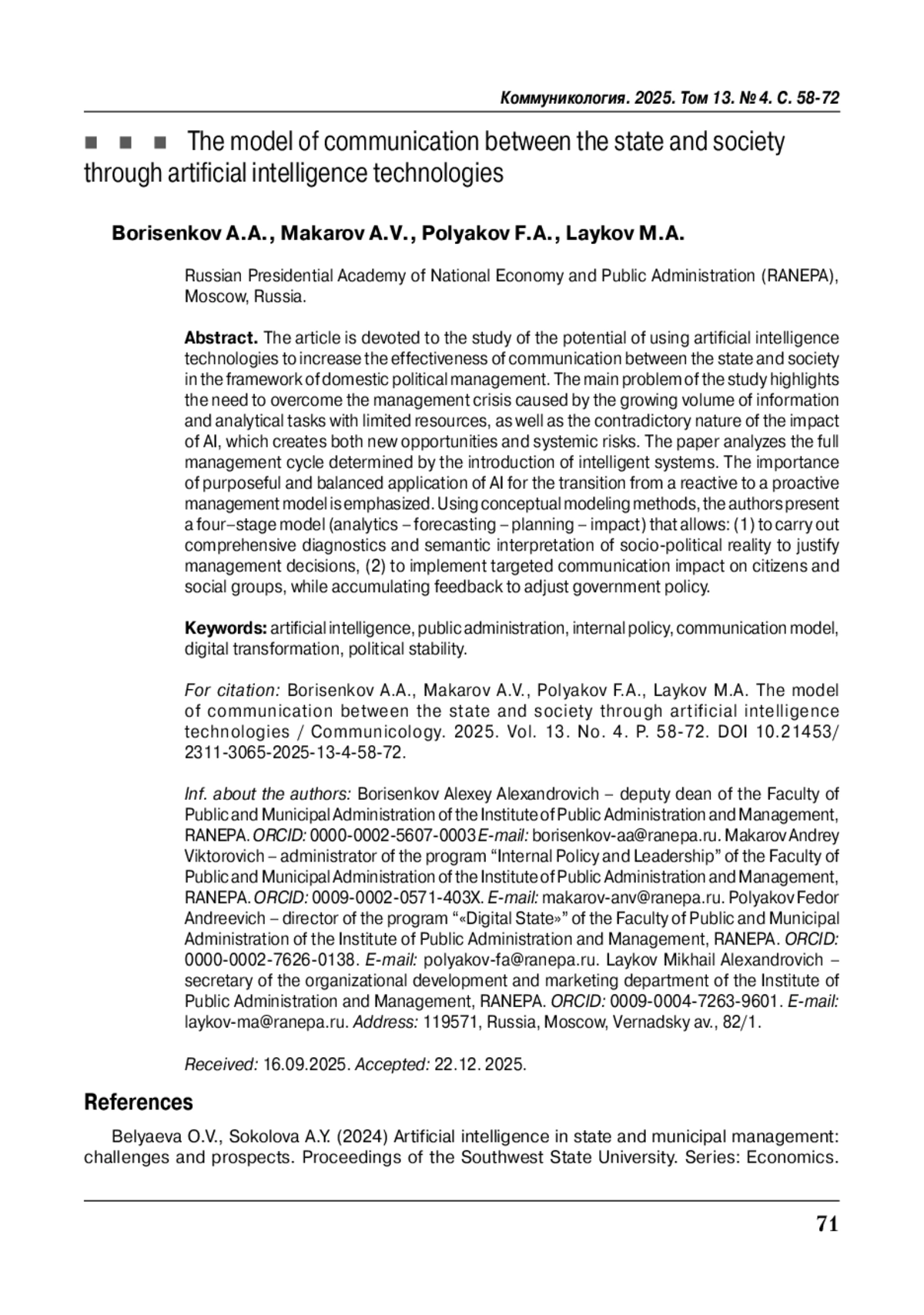 Статья посвящена исследованию потенциа ла применения технологий искусственного интеллекта для повышения эффективности коммуникации государства и общества в рамках внутриполитического управления. Основной проблемой исследования выделяется необходимость преодоления управленческого кризиса, вызванного ростом объема информационно-аналитических задач при ограниченных ресурсах, а также противоречивым характером влияния ИИ, создающего как новые возможности, так и системные риски. В работе анализируется полный управленческий цикл, детерминируемый внедрением интеллектуальных систем. Подчеркивается значимость целенаправленного и сбалансированного применения ИИ для перехода от реактивной к проактивной модели управления. Используя методы концептуального моделирования, авторы представляют четырехэтапную модель (аналитика – прогнозирование – планирование – воздействие), которая позволяет: (1) осуществлять комплексную диагностику и смысловую интерпретацию социально-политической реальности для обоснования управленческих решений, (2) реализовывать адресное коммуникационное воздействие на граждан и социальные группы, одновременно аккумулируя обратную связь для корректировки государственной политики.
