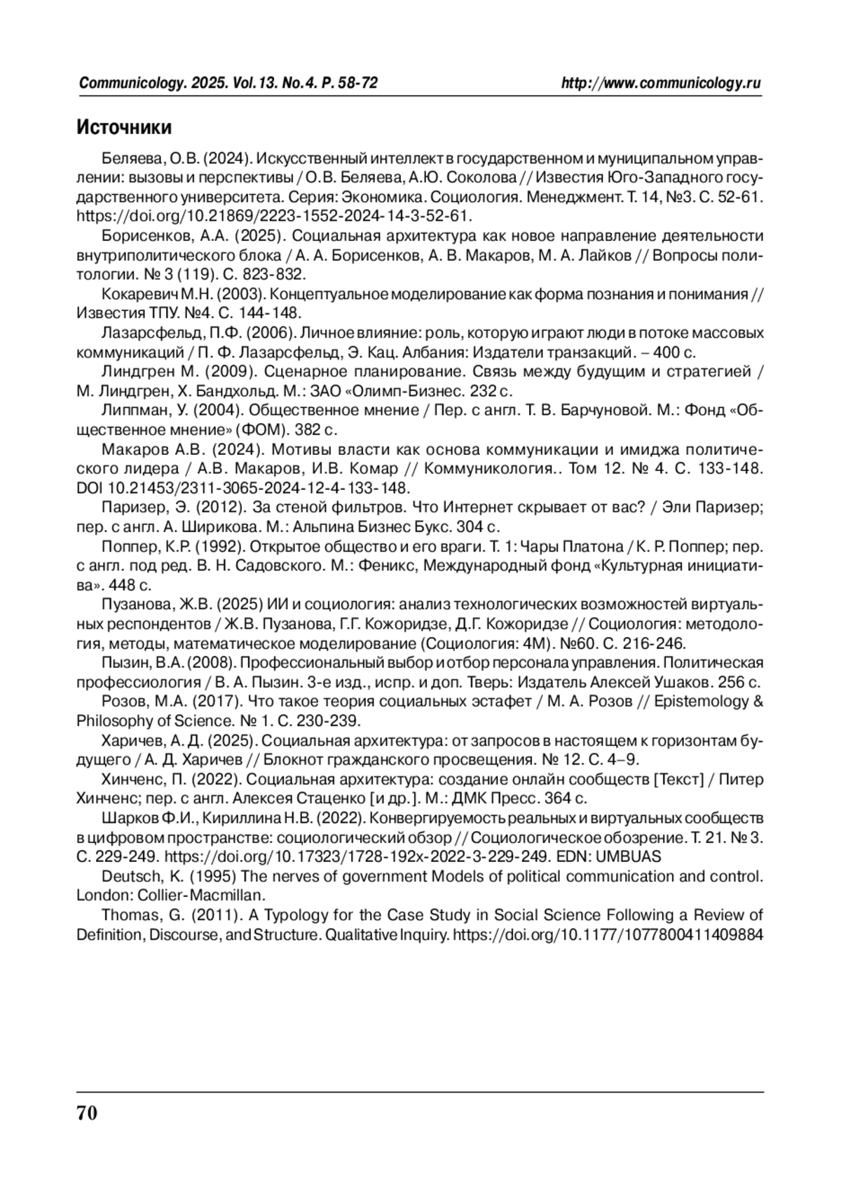 10. Пузанова, Ж.В. (2025) ИИ и социология: анализ технологических возможностей виртуальных респондентов / Ж.В. Пузанова, Г.Г. Кожоридзе, Д.Г. Кожоридзе // Социология: методология, методы, математическое моделирование (Социология: 4М). №60. С. 216-246.