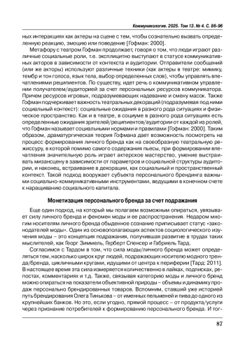 В работе рассматриваются следующие ключевые аспекты: драматургический подход к формированию персонального бренда, механизмы подражания и распространения влияния личного бренда, система коммуникаций бренда в современном обществе, практические аспекты построения личного бренда.