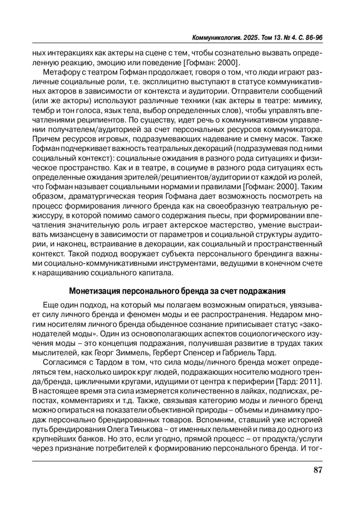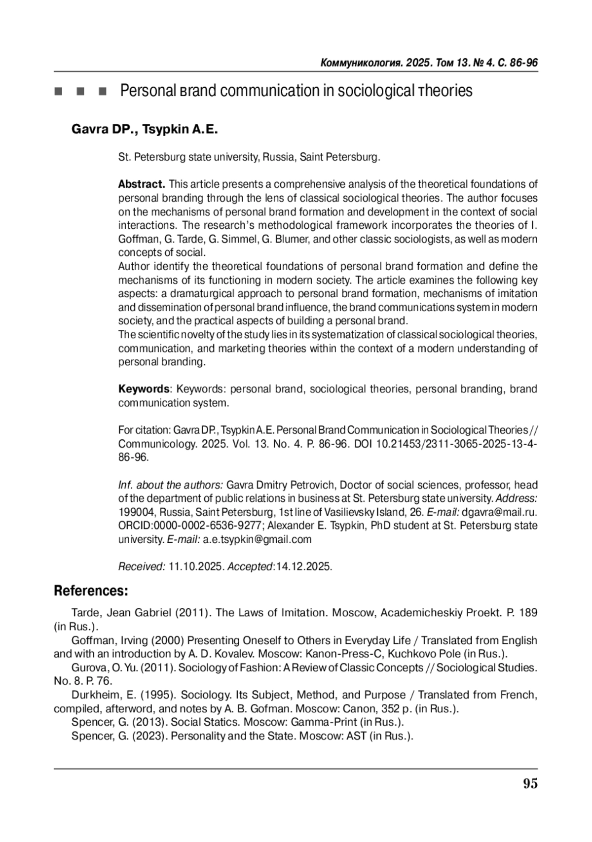 В статье представлен комплексный анализ теоретических основ личного брендинга через призму классических социологических теорий. Автор фокусируется на изучении механизмов формирования и развития персонального бренда в контексте социальных взаимодействий. Методологическая база исследования включает теории И. Гофмана, Г. Тарда, Г. Зиммеля, Г. Блумера и других классиков социологии, а также современные концепции социальной коммуникации. Авторы с опорой на работы классических социологов выявляют теоретические основы формирования личного бренда и определяет механизмы его функционирования в современном обществе.