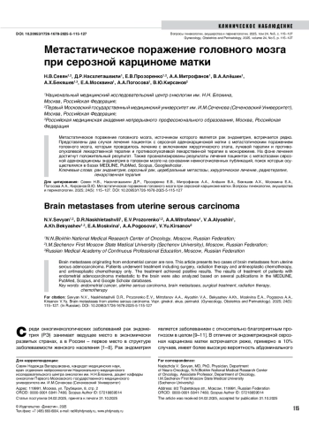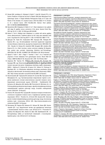 27. Севян НВ, Карахан ВБ, Прозоренко ЕВ, Бекяшев АХ, Митрофанов АА. Опыт хирургического лечения церебральных метастазов опухолей органов женской репродуктивной системы: анализ 37 случаев. Вопросы нейрохирургии им. Н.Н.Бурденко. 2021;85(1):56-67. DOI: 10.17116/neiro20218501156