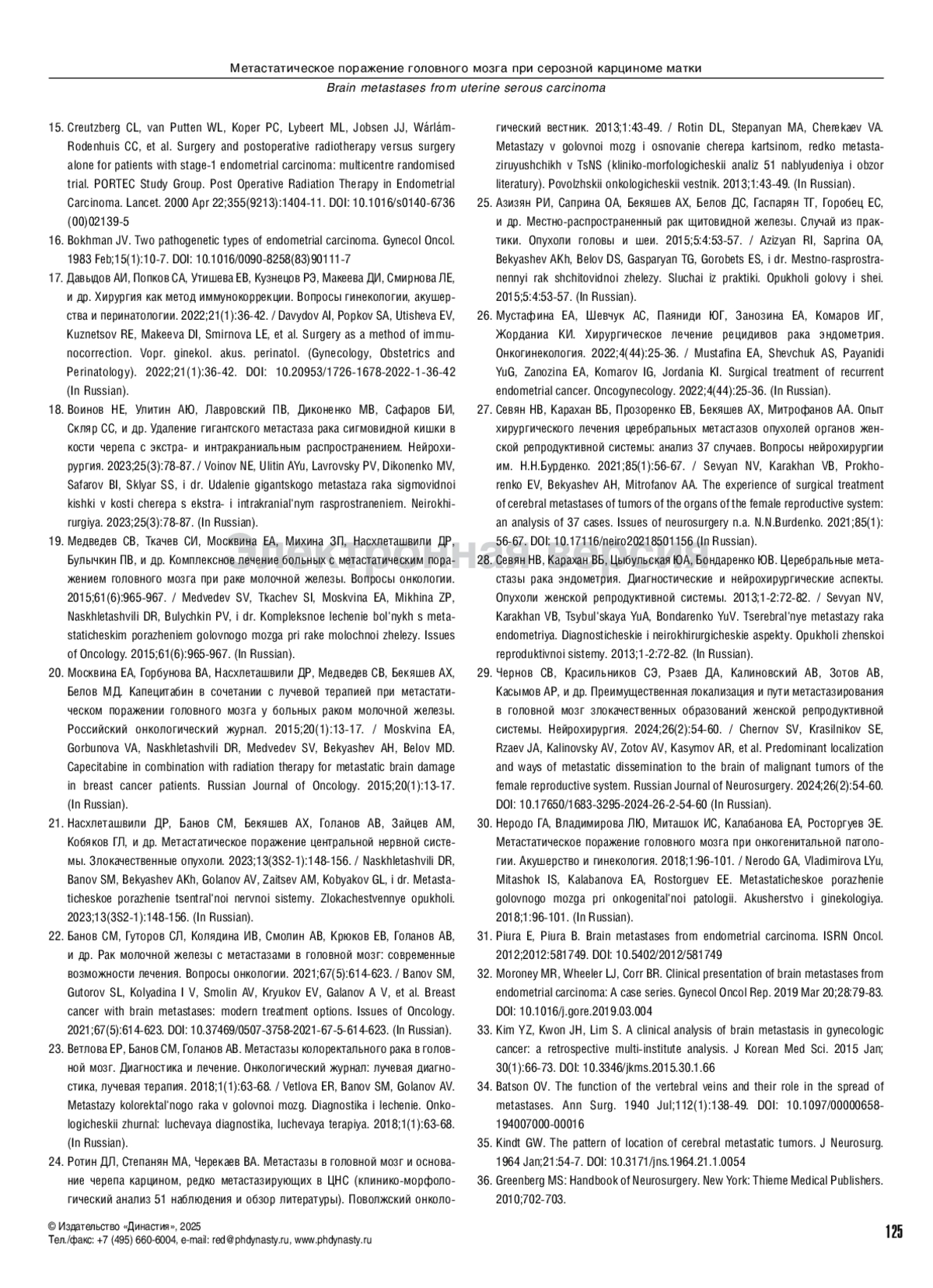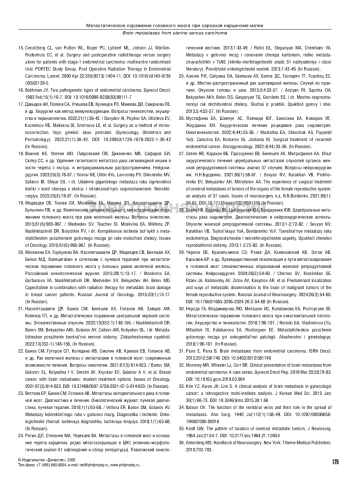 28. Севян НВ, Карахан ВБ, Цыбульская ЮА, Бондаренко ЮВ. Церебральные метастазы рака эндометрия. Диагностические и нейрохирургические аспекты. Опухоли женской репродуктивной системы. 2013;1-2:72-82.