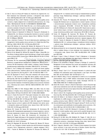 26. Мустафина ЕА, Шевчук АС, Паяниди ЮГ, Занозина ЕА, Комаров ИГ, Жорданиа КИ. Хирургическое лечение рецидивов рака эндометрия. Онкогинекология. 2022;4(44):25-36.