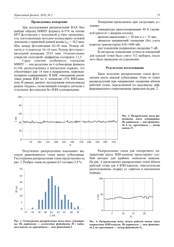 Исследованы методы измерения вольт-амперных характеристик (ВАХ) фотодиодов в многорядном фотоприемнике формата 6576 на основе КРТ длинноволнового диапазона спектра. ВАХ строится по результатам измерений выходных сигналов большой интегральной схемы (БИС) считывания, гибридизированной с линейкой ИК-фотодиодов. Проведено сравнение метода независимого измерения тока в каждой точке ВАХ и метода аддитивного измерения тока. Предложен метод определения оптимальных рабочих точек фотодиодов путем построения и анализа зависимости дифференциального сопротивления фотодиода от напряжения смещения. Рассмотрены распределения токов фотодиодов для образца МФПУ формата 6576 на основе КРТ-фотодиодов с подложкой p-типа проводимости с граничной длиной волны λ0,5 = 10,5 мкм.