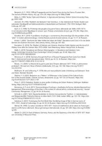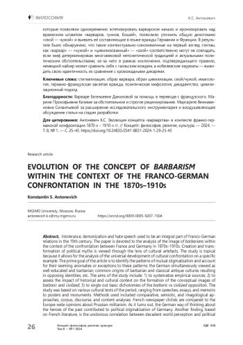 Статья посвящена анализу эволюции образа варваров в рамках французско-германского противостояния в 1870-е – 1910-е гг. Создание и видоизменение политических мифов рассматривается через призму культурных артефактов. Актуальность исследования заключается в возможности на частном примере межгосударственной межкультурной конфронтации рассмотреть универсальные закономерности её развития. Цель работы — установить «правила» взаимной стигматизации и найти объяснения исключениям, аномалиям, мнимым несоответствиям: сочетанию стереотипов об учёности, педантичности и варварстве немцев, разнице самоидентичностей при сходстве антично-варварского культурного генезиса и т. д. Соответственно в задачи исследования входило: 1) систематизация материалов исследования; 2) уточнение характера влияния культурно-исторического фона на концептуализацию образа «варварского» либо «цивилизованного»; 3) выявление в дихотомии «варвары/цивилизация» базисных антонимичных пар как составляющих «заклятой вражды». Материалами работы послужили разноплановые тексты рассматриваемого периода, от речей, эссе, мемуаров и писем до плакатов и памятников. В качестве основных методов исследования использованы компаративный, семиотический и имагологический подходы с применением корпусного анализа, дискурс-анализа и контент-анализа. Определению причин, по которым именно за немцами во французской оптике закрепился образ варваров (чего не произошло с французами в немецкой оптике), способствовал сравнительный анализ соответствующих образов, выделенных в разноплановых культурных артефактах, рассмотренных как текст культуры. Этот анализ показал, что на французскую вековую традицию называть внешних и внутренних врагов варварами и пропагандистский нарратив 1870-х гг. своевременно наложилась национальноромантическая специфика объединённой Германии с культом предков, закреплённым в песнях и монументах. Также была выделена взаимосвязь декадентского мироощущения «конца века» и политического коллапса Франции. Французские журналисты, писатели и поэты, сравнивая упадок империй, Римской и Французской, создали новую грань дихотомии «немецкие варвары — французская цивилизация». Рассмотрение приёмов немецкой контрпропаганды, которые позволяли одновременно эстетизировать варварское начало и иронизировать над вражеским штампом «варваров, гуннов, бошей», позволило уточнить общую дихотомию «свой — чужой» и выявить её составляющие в языке вражды Германии и Франции. В результате было обнаружено, что такие контекстуально-синонимичные на первый взгляд стигмы, как «варвар» — «чужой» и «цивилизованный» — «свой» соответственно могут не совпадать, если миф детерминирован многовековой неполитической традицией и актуальными политическим обстоятельствами, из-за чего в рамках исключения, подтверждающего правило, немецкий кайзер может сравнить себя с галльским вождем, а нобелевские лауреаты — выводить свою идентичность из сравнения с кровожадными дикарями.