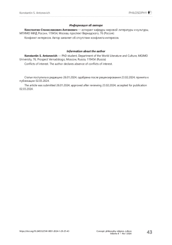Актуальность рассмотрения смыслового наполнения концепта «ужас», связывающего жанры кантри-нуар и южной готики в единую подсистему семиотики культуры, обусловлена необходимостью более детального изучения специфики как самого обобщающего концепта, так и его роли в конкретных жанрах литературы и кинематографа. Соответственно цель данного исследования — проследить особенности смысловых регистров раскрытия различных видов ужаса в философско-герменевтическом поле жанров кантри-нуар и южная готика. Для этого 1) определены теоретические основы концептуализации ужаса в названных жанрах, что предполагает выявление ключевых элементов и механизмов, через которые эти концепты реализуются; 2) проанализирован нарративный и метафорический ряды развёртывания указанных концептов в рамках конструируемых авторами жизненных миров героев художественных текстов; 3) выявлены философско-герменевтические пласты, через которые происходит раскрытие данных концептов в избранных жанрах. Методы исследования основаны на философско-герменевтическом, концептологическом и нарративном подходах в анализе ряда произведений, выбор которых был определён их жанровой принадлежностью и степенью их релевантности для того или иного вида концептуализации ужаса. В качестве примера были взяты произведения «Старикам тут не место» Кормака Маккарти, «Зимняя кость» Дэниела Вудрелла, «Соль земли» Фланнери О’Коннор, «Последний хороший поцелуй» Джеймса Крамли, «Шум и ярость» Уильяма Фолкнера, а также кинофильм «Что видел Иосия»; последовательность приведения произведений в тексте статьи обусловлена последовательностью описания выявленных видов ужаса. В результате исследования подтверждена гипотеза о том, что концептуализация ужаса как нарушения привычного хода детерминации обнаруживает себя в трёх вариантах онтологизации этого переживания: ужас неопределённого мира (детерминация, зависимая от рамок восприятия субъекта, выступающая как выражение радикального внешнего, находящегося вне власти субъекта), ужас неопределённого себя (детерминация как порядок окружающего мира при неопределённости внутреннего мира личности), ужас вторжения (детерминации смещают друг друга). Обоснован вывод, согласно которому исследование ужаса как результата нарушения привычного хода детерминации в контексте кантри-нуар и южной готики позволяет не только выявить их имплицитную философско-культурную составляющую, но и глубже понять эти жанры, а также расширить теоретическую базу анализа подобных явлений в других культурных и литературных традициях.