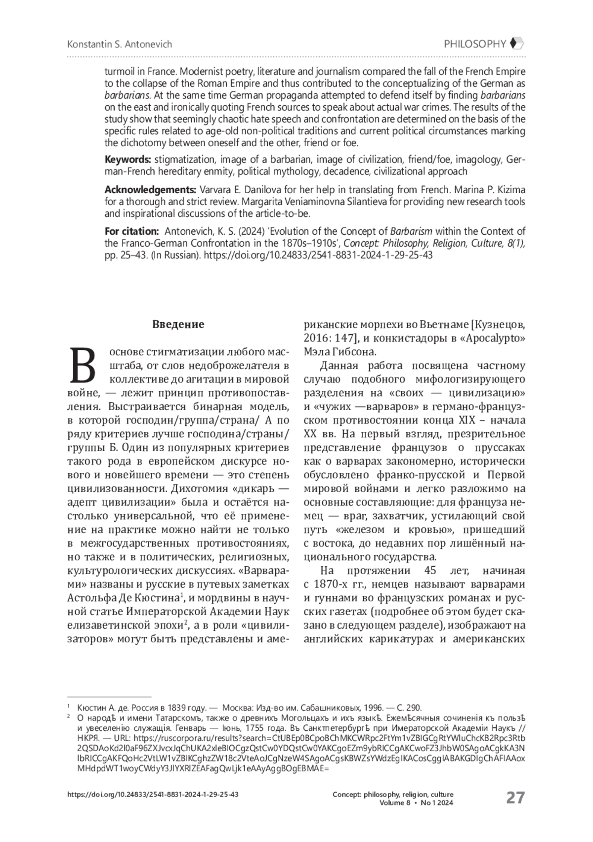Отечественные исследователи также применяли задействованный Э. Гуссерлем и Б. Вальденфельсом культурно-антропологический подход к дихотомии «свой/ чужой» в целом [Коротков, 2010; Феноменология Чужого…, 2011] и «варварство/ цивилизация» в частности [Обидина, 2023: 107–125].
