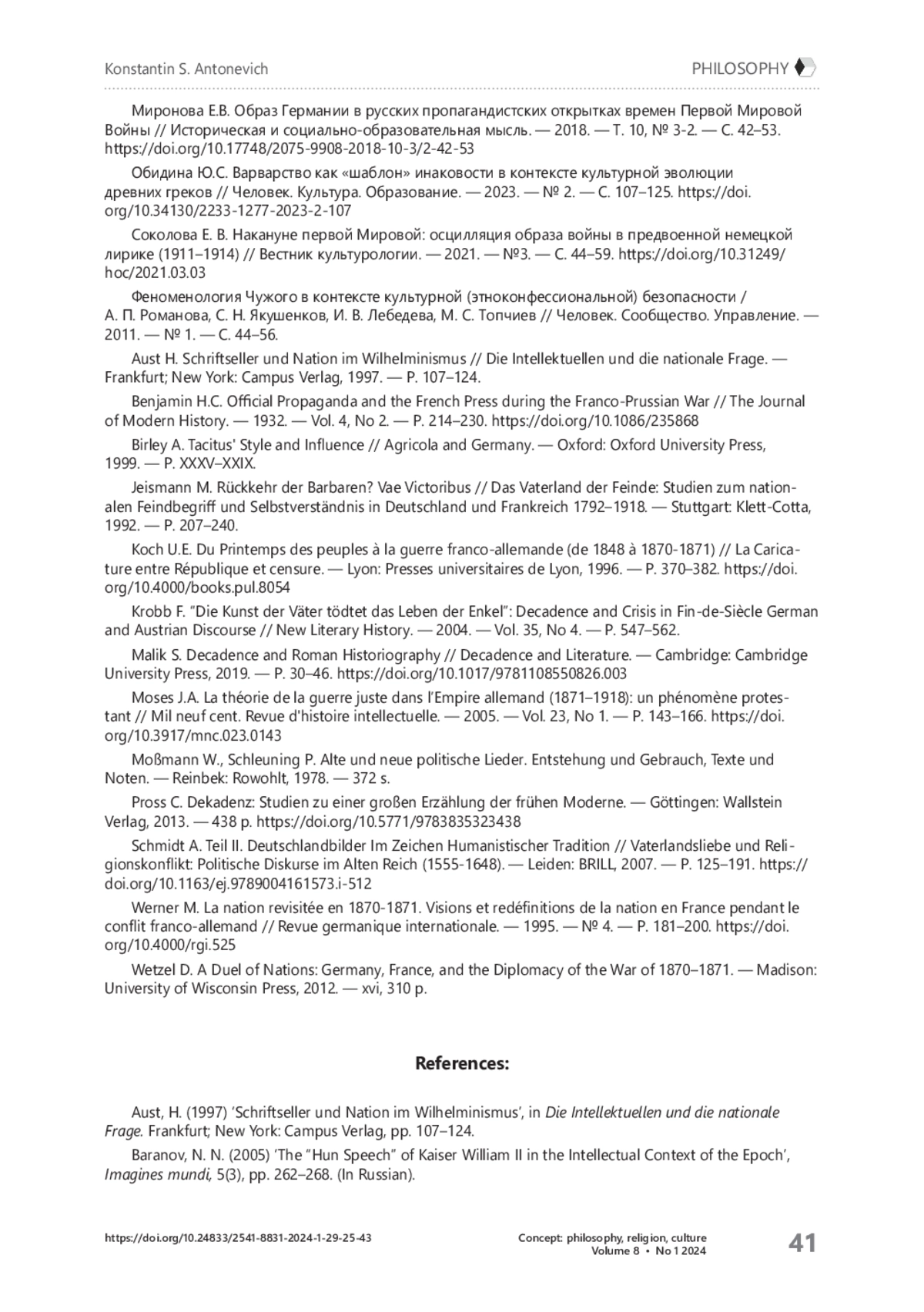 1. Баранов Н.Н. «Гуннская речь» кайзера Вильгельма II в интеллектуальном контексте эпохи // Imagines Mundi: Альманах исследований всеобщей истории XVI-XX вв. - 2008. - Т. 5, № 3. - С. 262-268.