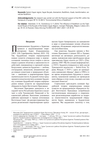 В статье на основе полевых материалов рассматривается трансформация мировоззрения бурят Восточного Присаянья под влиянием буддизма. Актуальность исследования обусловлена необходимостью уточнения ценностных матриц традиционного общества этого региона, бытующих на современном этапе. Цель исследования — выявить ключевые особенности взаимодействия традиционной обрядности с более поздними верованиями у носителей этих матриц. Для достижения названной цели необходимо было решить ряд задач. Прежде всего, были систематизированы современные научные представления о влиянии буддизма на традиционные верования; выделены специфические отношения буддизма, «классического» шаманизма и традиционных верований; уточнены доминирующие ценности буддизма, реинтерпретирующие наследие совмещённых с ним религиозных практик. Далее на основе анализа полевых исследований были раскрыты наиболее существенные отличия трактовок таких реинтерпретированных ценностей, выделяющие их из «традиционного» буддизма; на примерах действующих обычаев прослежено развитие процесса интеграции буддийского мировосприятия в уже существующую обрядовую культуру присаянских бурят наших дней. Методология исследования включает в себя сравнительноисторический, сравнительно-религиоведческий и герменевтический подходы. В полевом исследовании использован метод интервью. В результате подтверждена роль буддизма как способа адаптивного переосмысления наследия традиционной культуры в свете современного кризиса ценностей, связанного в том числе с забвением традиций, потребительским отношением к окружающему миру, природе, обществу и даже к близким. Обращение к буддизму в Восточном Присаянье сегодня, как и в прошлом, становится одним из способов преодоления подобных негативных явлений. Буддизм региона не только впитал в себя верования, существовавшие на разных этапах истории этнической Бурятии, но и адаптировал их к своей вероучительной практике. Буддийское мировоззрение подобного типа соответствует принятым в современном религиоведении представлениям о вернакулярной религии. Формируя синкретически целостную картину мира, соответствующую местным условиям и историческому периоду, вернакулярный буддизм определяет широкий спектр действующих ценностей, идейно и практически инкорпорировавших сложившуюся веками обрядовую культуру.