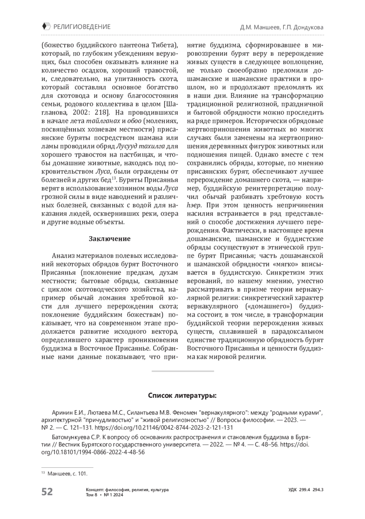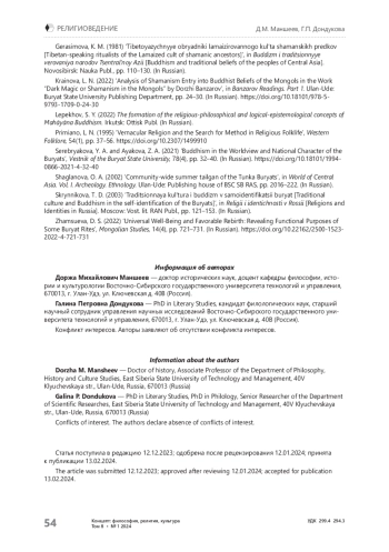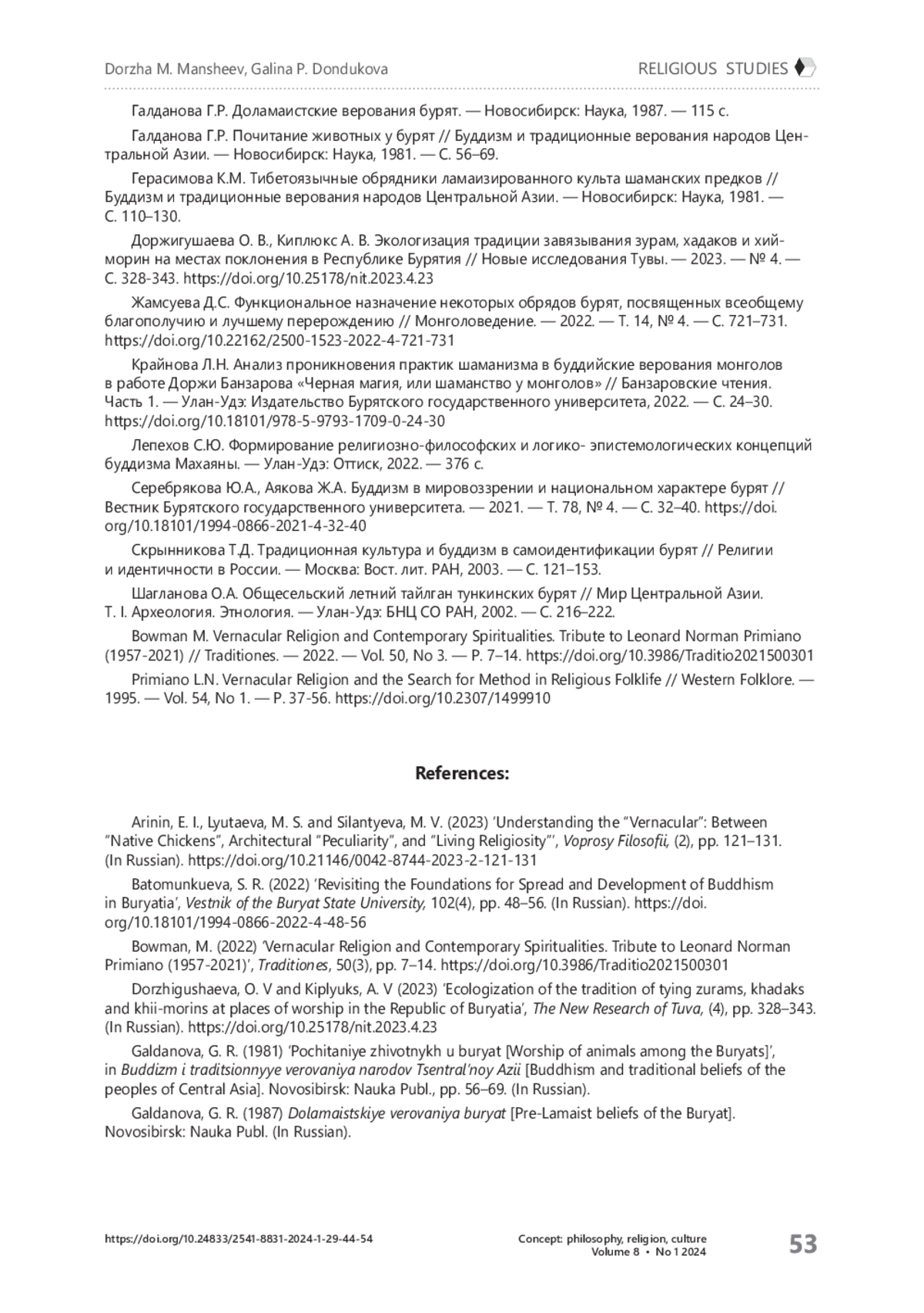 7. Жамсуева Д.С. Функциональное назначение некоторых обрядов бурят, посвященных всеобщему благополучию и лучшему перерождению // Монголоведение. - 2022. - Т. 14, № 4. - С. 721-731. https://doi.org/10.22162/2500-1523-2022-4-721-731