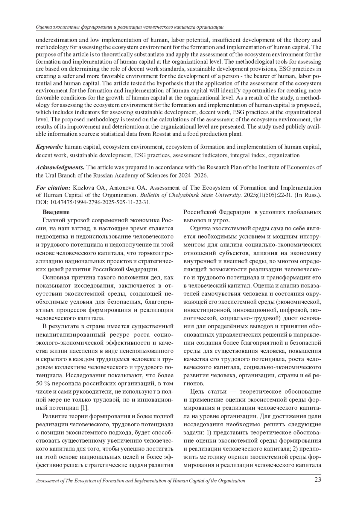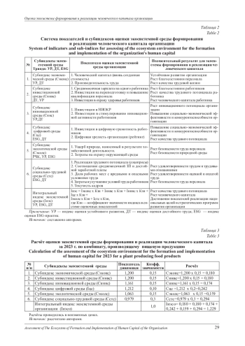 Оценка экосистемы формирования и реализации человеческого капитала может стать важным инструментом роста эффективности экономики. Однако имеют место недополучение человеческого капитала в связи с его недооценкой и низкой реализацией человеческого, трудового потенциала, недостаточной разработанностью теории и методологии оценки экосистемной среды формирования и реализации человеческого капитала. Цель статьи теоретическое обоснование и применение оценки экосистемной среды формирования и реализации человеческого капитала на уровне организации. Методический инструментарий оценки основан на определении роли стандартов достойного труда, положений устойчивого развития, ESG-практик в создании более безопасной и благоприятной среды для развития человека - носителя человеческого, трудового потенциала и человеческого капитала. В статье проверялась гипотеза о том, что применение оценки экосистемной среды формирования и реализации человеческого капитала, позволит определить возможности для создания более благоприятных условий роста человеческого капитала на уровне организации. В результате исследования предложена методика оценки экосистемной среды формирования и реализации человеческого капитала, которая включает показатели оценки устойчивого развития, достойного труда, ESG-практик на уровне организации. Предложенная методика апробирована на расчётах оценки экосистемной среды, представлены результаты, улучшающие и ухудшающие её на уровне организации. В исследовании использовались информационные источники, имеющиеся в открытом доступе: статистические данные Росстата, комбината по производству пищевых продуктов.
