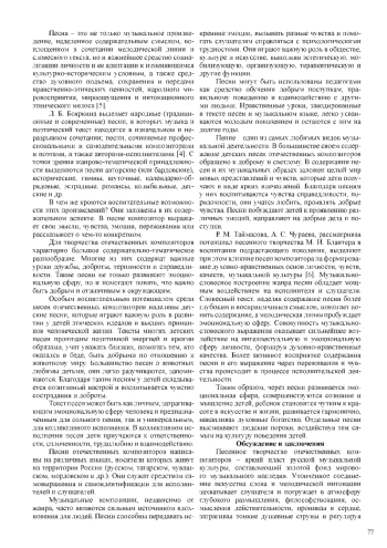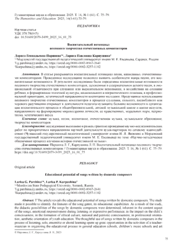 В статье раскрывается воспитательный потенциал песен, написанных отечественными композиторами. Проведенное исследование позволило выявить особенности жанра песни, его воспитательные возможности. В результате исследования были определены воспитательные возможности песенного творчества отечественных композиторов, заложенные в содержательном аспекте песен, в эмоциональной отзывчивости при слушании или выразительном исполнении, в воздействии на сознание ребенка, в формировании этической культуры, национального и патриотического сознания, в профессиональной ориентации, эстетической направленности воспитания молодежи. Продуманное использование песенного творчества отечественных композиторов в процессе слушания, сольного, ансамблевого или хорового разучивания открывает в деятельности педагога-музыканта большие возможности в организации воспитательного процесса в общеобразовательной, детской музыкальной школе и школе искусств, направленного на формирование мировоззрения личности, ее нравственных, моральных норм, патриотизма, эстетического вкуса.