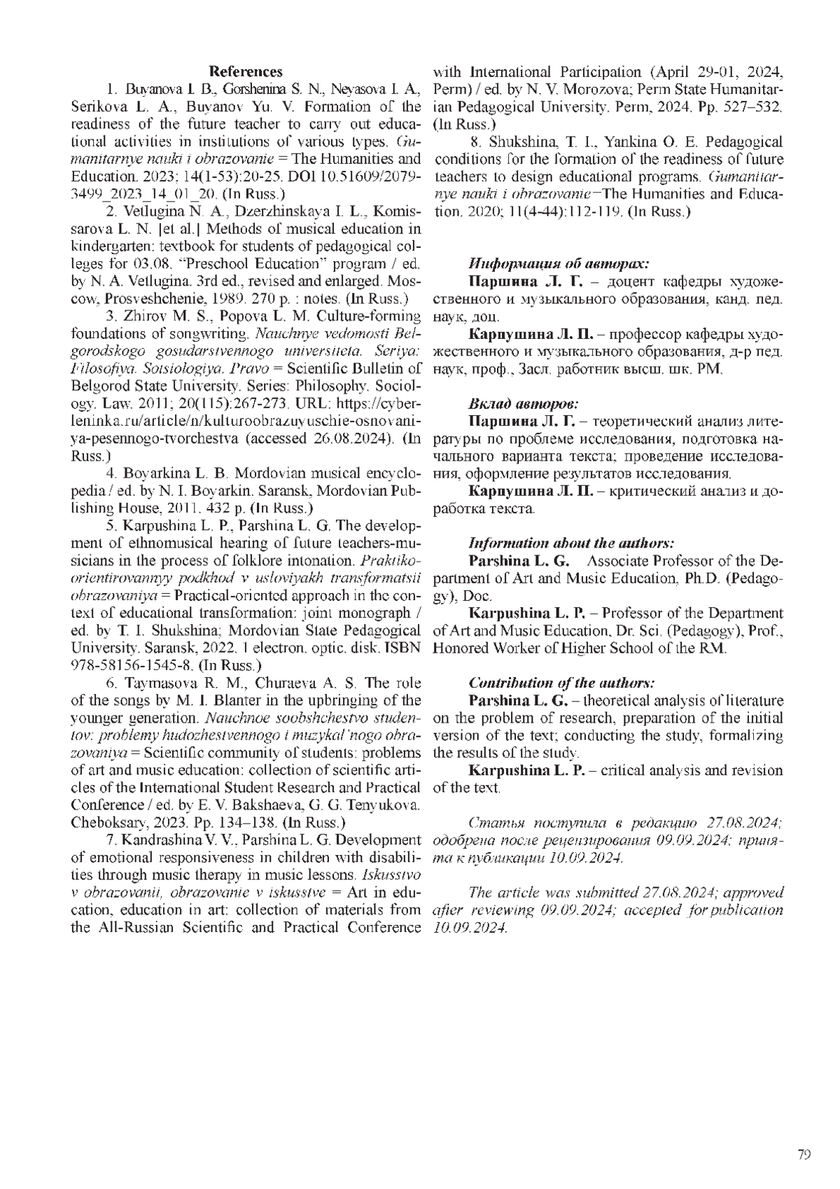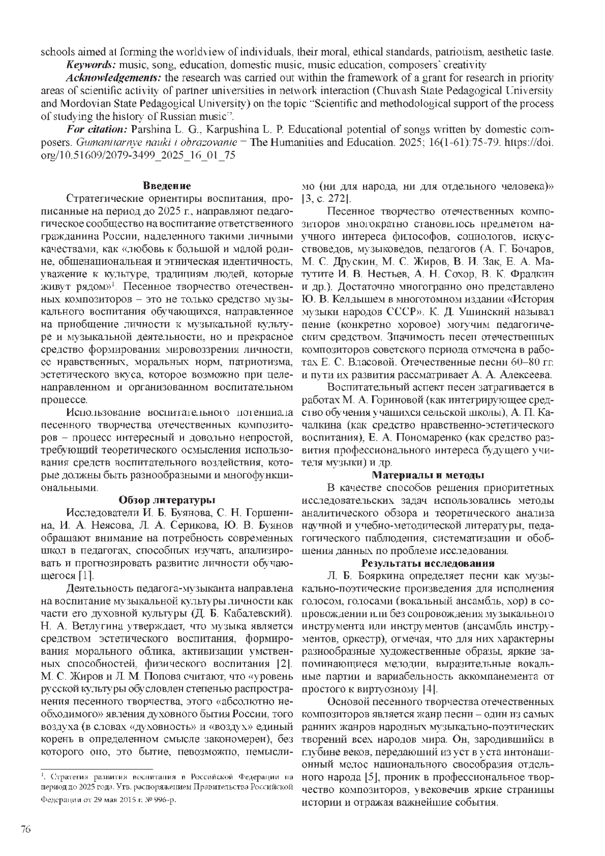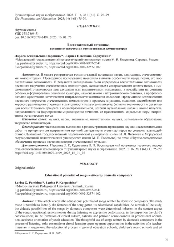 5. Карпушина Л. П., Паршина Л. Г. Развитие этномузыкального слуха будущих педагогов-музыкантов в процессе фольклорного интонирования // Практико-ориентированный подход в условиях трансформации образования: коллективная монография / под ред. Т. И. Шукшиной; Мордов. гос. пед. университет. Саранск, 2022. 1 электрон, опт. диск. 978-58156-1545-8. ISBN: 978-5-8156-1545-8 EDN: NYOTQF