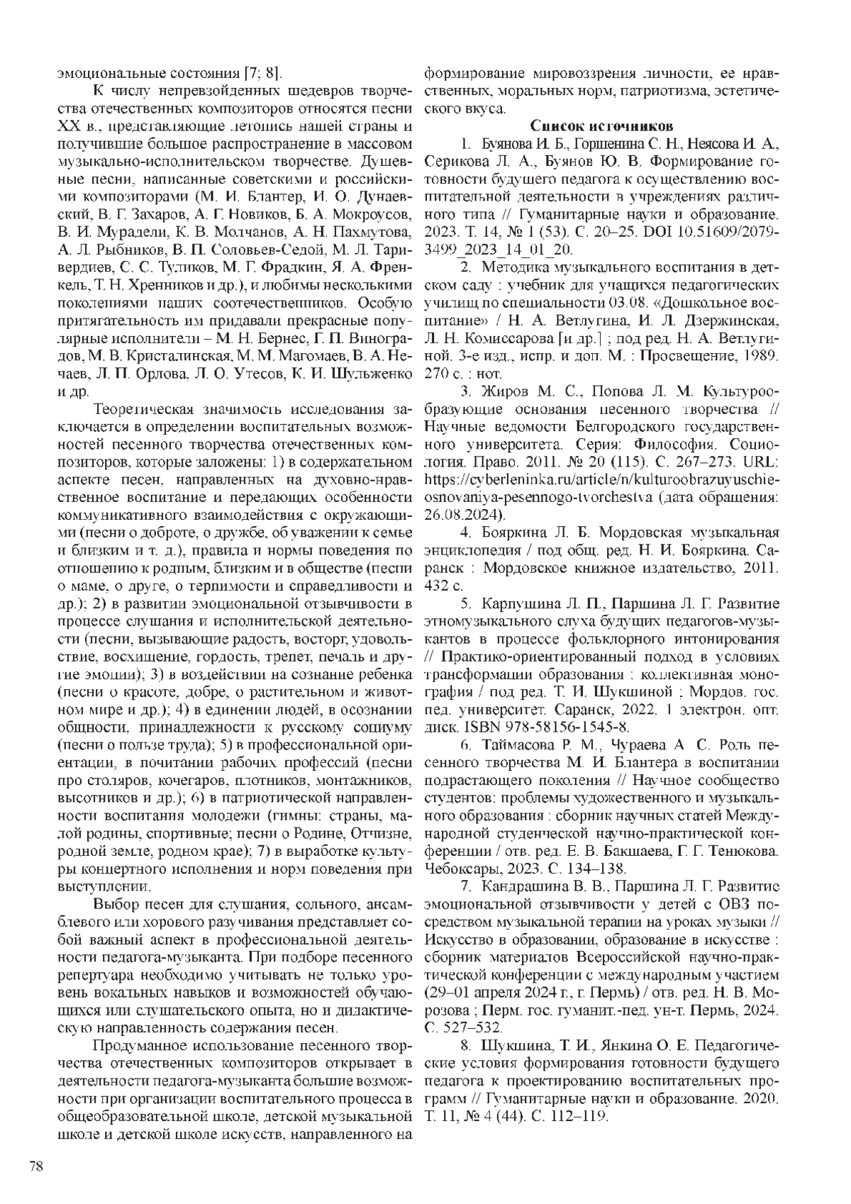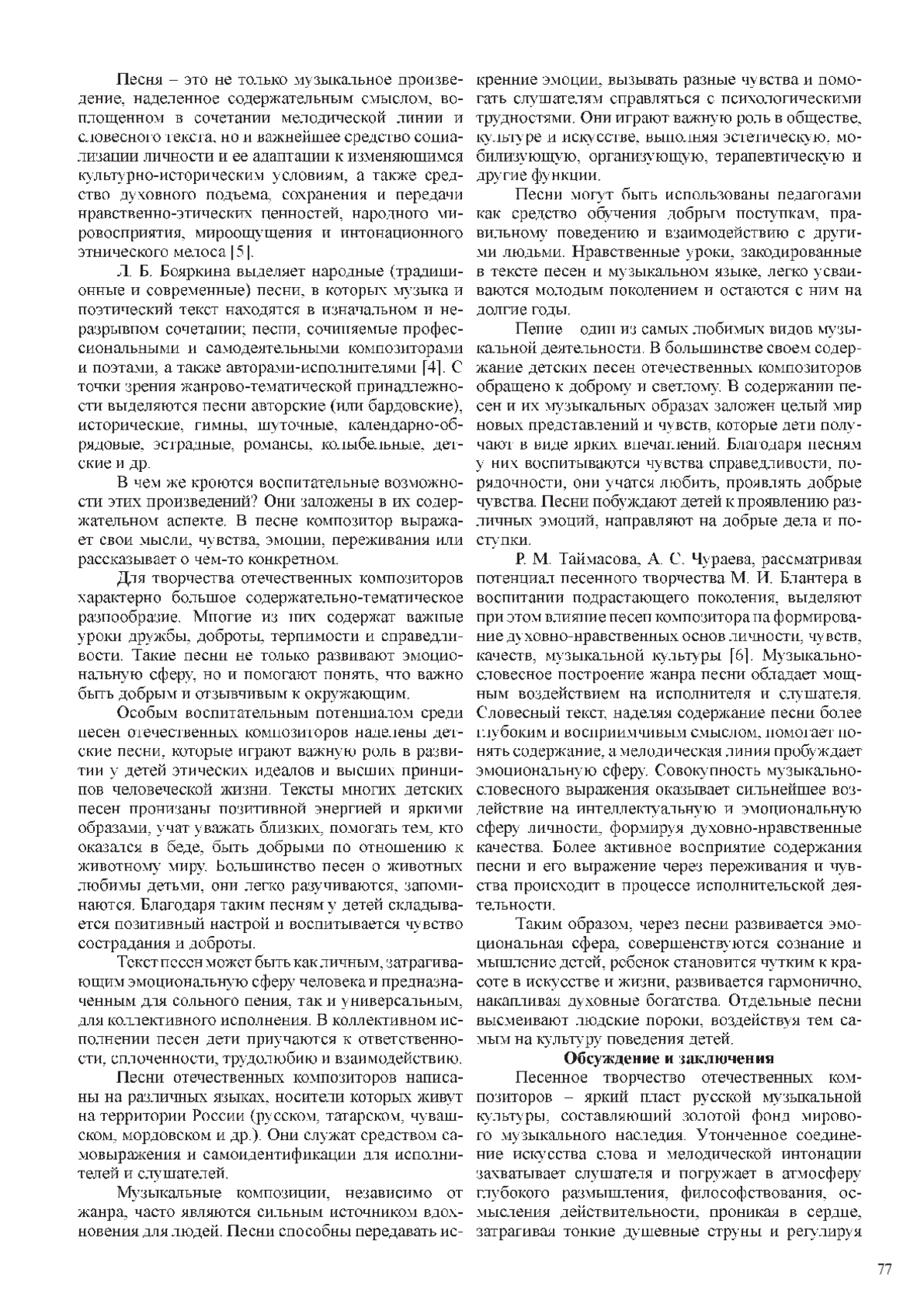 6. Таймасова Р. М., Чураева А. С. Роль песенного творчества М. И. Блантера в воспитании подрастающего поколения // Научное сообщество студентов: проблемы художественного и музыкального образования: сборник научных статей Международной студенческой научно-практической конференции / отв. ред. Е. В. Бакшаева, Г. Г. Тенюкова. Чебоксары, 2023. С. 134-138. EDN: MXFZON