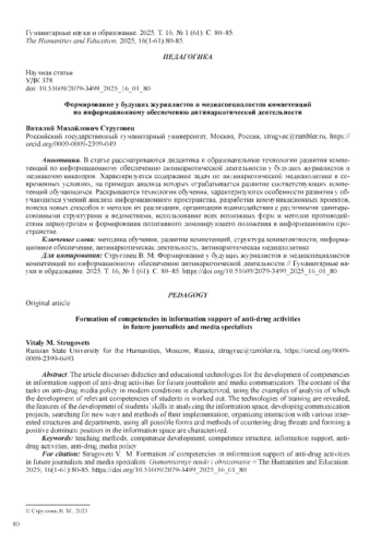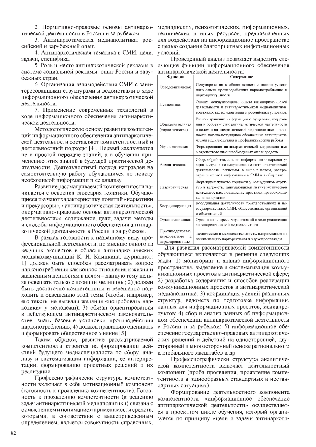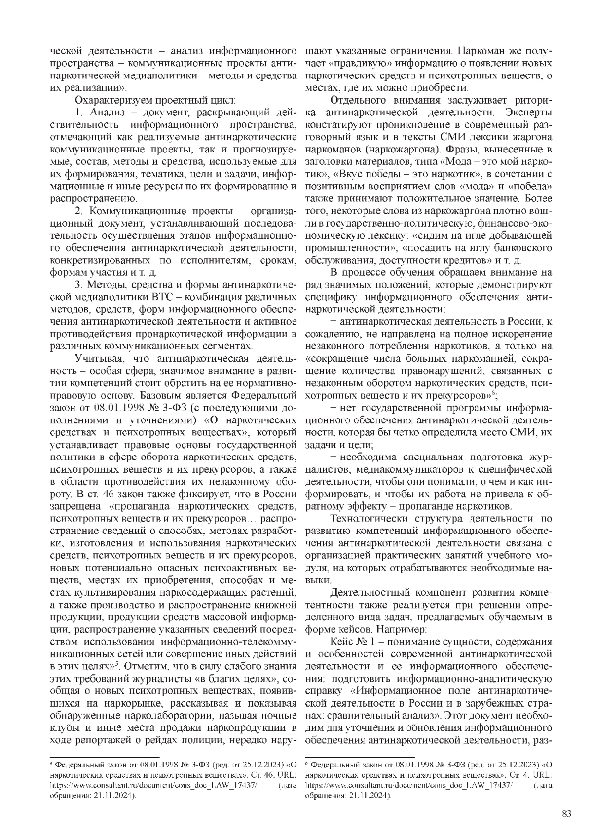 В статье рассматриваются дидактика и образовательные технологии развития компетенций по информационному обеспечению антинаркотической деятельности у будущих журналистов и медиакоммуникаторов. Характеризуется содержание задач по антинаркотической медиаполитике в современных условиях, на примерах анализа которых отрабатывается развитие соответствующих компетенций обучающихся. Раскрываются технологии обучения, характеризуются особенности развития у обучающихся умений анализа информационного пространства, разработки коммуникационных проектов, поиска новых способов и методов их реализации, организации взаимодействия с различными заинтересованными структурами и ведомствами, использование всех возможных форм и методов противодействия наркоугрозам и формирования позитивного доминирующего положения в информационном пространстве.