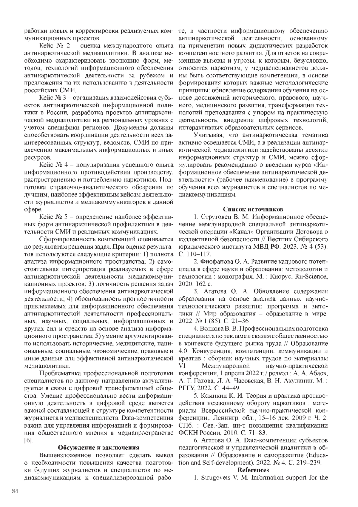 6. Агатова О. А. Data-компетенции субъектов педагогической и управленческой аналитики в образовании // Образование и саморазвитие (Education and Self-development). 2022. № 4. С. 219-239.