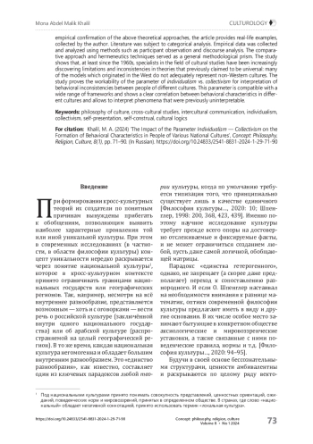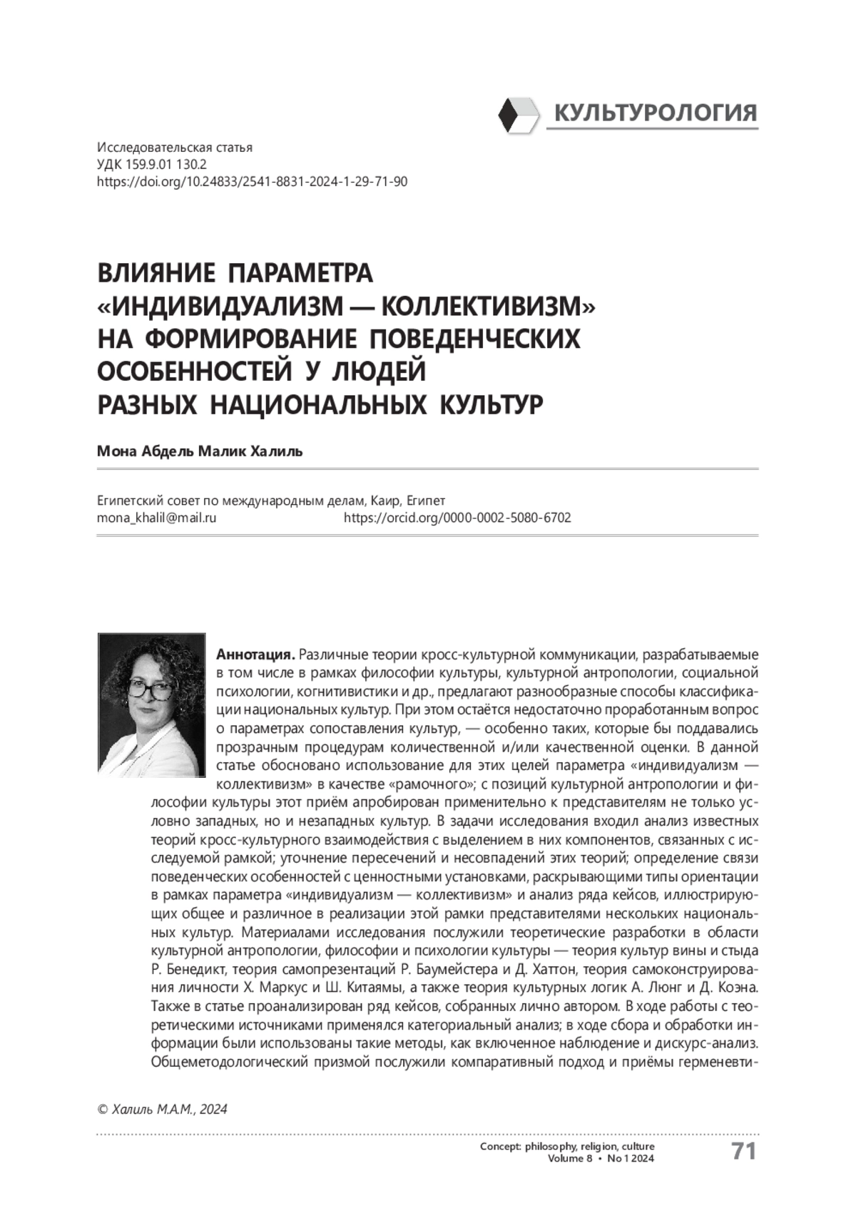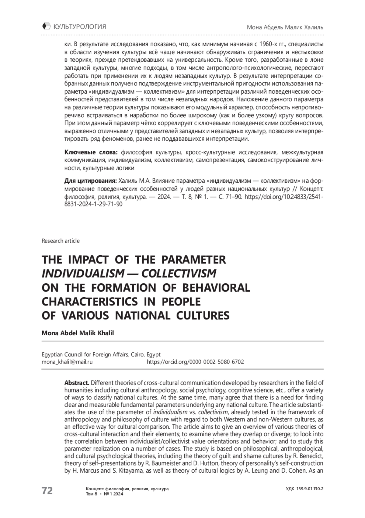 Различные теории кросс-культурной коммуникации, разрабатываемые в том числе в рамках философии культуры, культурной антропологии, социальной психологии, когнитивистики и др., предлагают разнообразные способы классификации национальных культур. При этом остаётся недостаточно проработанным вопрос о параметрах сопоставления культур, — особенно таких, которые бы поддавались прозрачным процедурам количественной и/или качественной оценки. В данной статье обосновано использование для этих целей параметра «индивидуализм — коллективизм» в качестве «рамочного»; с позиций культурной антропологии и философии культуры этот приём апробирован применительно к представителям не только условно западных, но и незападных культур. В задачи исследования входил анализ известных теорий кросс-культурного взаимодействия с выделением в них компонентов, связанных с исследуемой рамкой; уточнение пересечений и несовпадений этих теорий; определение связи поведенческих особенностей с ценностными установками, раскрывающими типы ориентации в рамках параметра «индивидуализм — коллективизм» и анализ ряда кейсов, иллюстрирующих общее и различное в реализации этой рамки представителями нескольких национальных культур. Материалами исследования послужили теоретические разработки в области культурной антропологии, философии и психологии культуры — теория культур вины и стыда Р. Бенедикт, теория самопрезентаций Р. Баумейстера и Д. Хаттон, теория самоконструирования личности Х. Маркус и Ш. Китаямы, а также теория культурных логик А. Люнг и Д. Коэна. Также в статье проанализирован ряд кейсов, собранных лично автором. В ходе работы с теоретическими источниками применялся категориальный анализ; в ходе сбора и обработки информации были использованы такие методы, как включенное наблюдение и дискурс-анализ. Общеметодологический призмой послужили компаративный подход и приёмы герменевтики. В результате исследования показано, что, как минимум начиная с 1960-х гг., специалисты в области изучения культуры всё чаще начинают обнаруживать ограничения и нестыковки в теориях, прежде претендовавших на универсальность. Кроме того, разработанные в лоне западной культуры, многие подходы, в том числе антрополого-психологические, перестают работать при применении их к людям незападных культур. В результате интерпретации собранных данных получено подтверждение инструментальной пригодности использования параметра «индивидуализм — коллективизм» для интерпретации различий поведенческих особенностей представителей в том числе незападных народов. Наложение данного параметра на различные теории культуры показывают его модульный характер, способность непротиворечиво встраиваться в наработки по более широкому (как и более узкому) кругу вопросов. При этом данный параметр чётко коррелирует с ключевыми поведенческими особенностями, выраженно отличными у представителей западных и незападных культур, позволяя интерпретировать ряд феноменов, ранее не поддававшихся интерпретации.