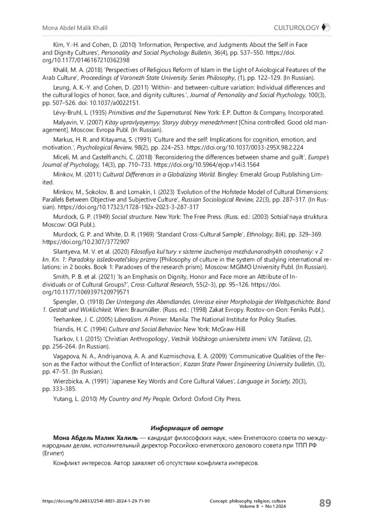 22. Kim Y.-H., Cohen D. Information, Perspective, and Judgments About the Self in Face and Dignity Cultures // Personality and Social Psychology Bulletin. - 2010. - Vol. 36, № 4. - P. https://doi.org/https://doi.org/10.1177/0146167210362398