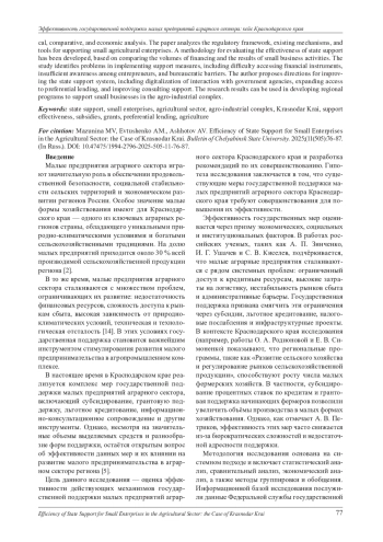В статье рассматривается эффективность мер государственной поддержки малых предприятий аграрного сектора Краснодарского края. Цель исследования - оценка действующих механизмов государственной поддержки и разработка рекомендаций по их совершенствованию. Методология исследования включает системный подход, статистический, сравнительный и экономический анализ. Проанализированы действующие механизмы и инструменты поддержки малых аграрных предприятий. Разработана методика оценки эффективности господдержки, основанная на сопоставлении объёмов финансирования и результатов деятельности субъектов малого предпринимательства. Выявлены проблемы реализации мер поддержки, включая сложность доступа к финансовым инструментам, недостаточную информированность предпринимателей, бюрократические барьеры. Предложены направления совершенствования системы государственной поддержки, среди которых цифровизация взаимодействия с государственными органами, расширение доступа к льготному кредитованию, совершенствование консультационного сопровождения. Результаты исследования могут быть использованы при разработке региональных программ поддержки малого предпринимательства в агропромышленном комплексе.