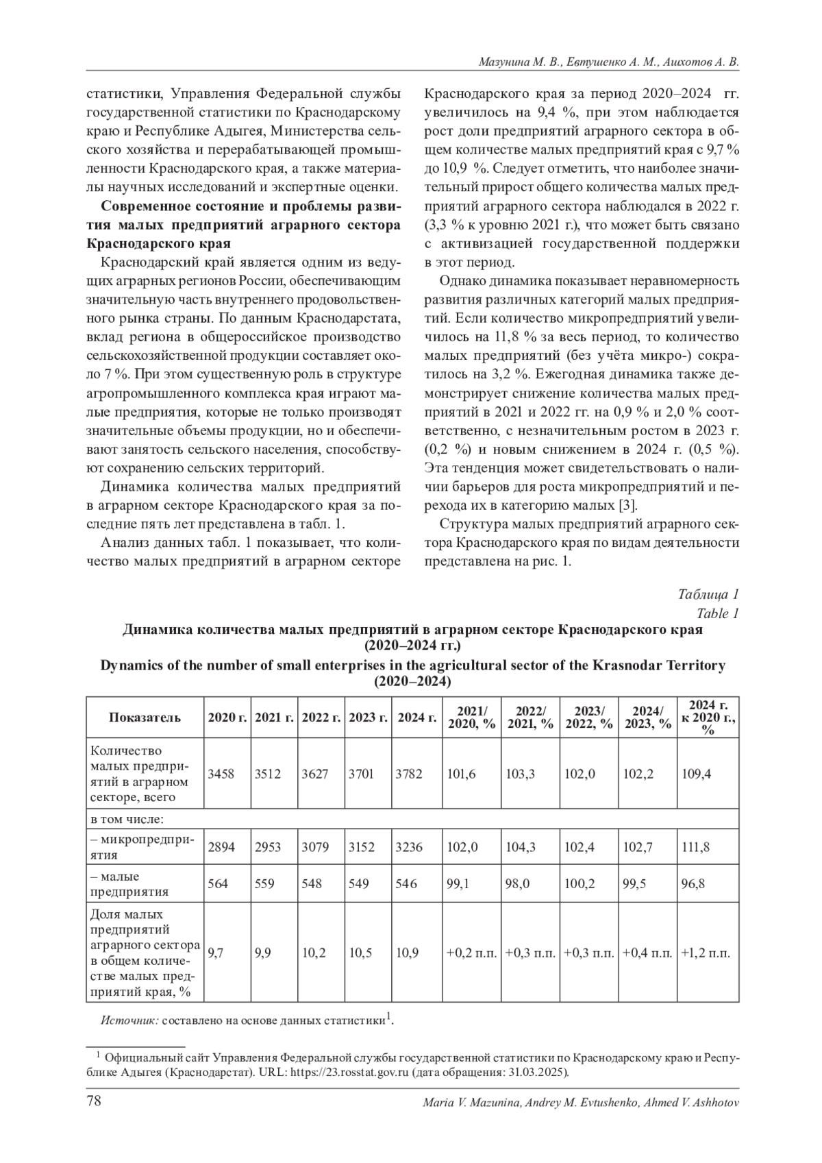 Малые предприятия аграрного сектора играют значительную роль в обеспечении продовольственной безопасности, социальной стабильности сельских территорий и экономическом развитии регионов России. Особое значение малые формы хозяйствования имеют для Краснодарского края — одного из ключевых аграрных регионов страны, обладающего уникальными природно-климатическими условиями и богатыми сельскохозяйственными традициями. На долю малых предприятий приходится около 30 % всей производимой сельскохозяйственной продукции региона [2].