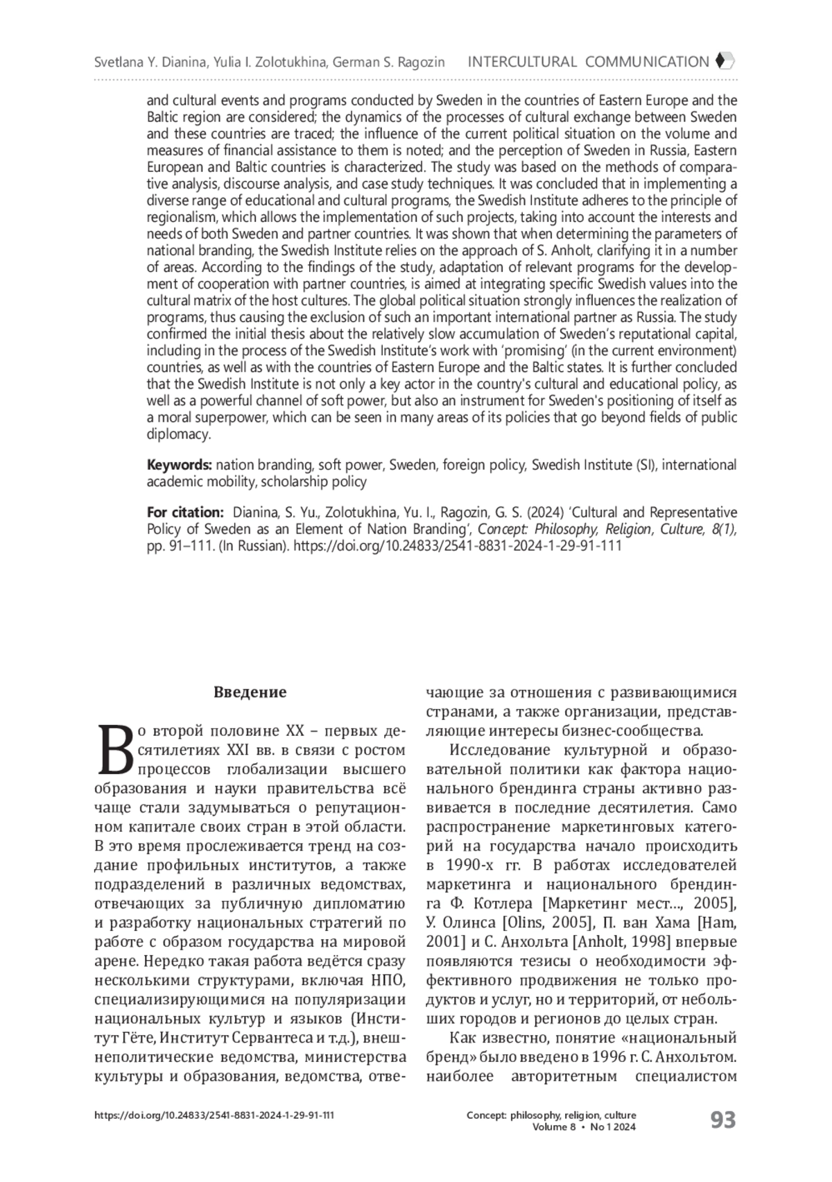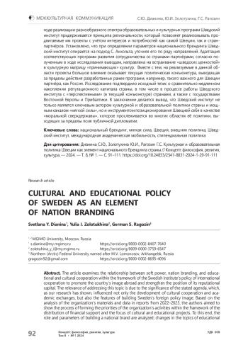 Статья исследует взаимосвязь стратегий национального брендинга в ходе реализации образовательного и культурного сотрудничества со странами-партнёрами на примере деятельности специализированной организации — Шведского института, созданного для продвижения образа страны за рубежом и усиления позиций её репутационного капитала. Актуальность обращения к этой теме обусловлена значением заявленной повестки, которая, как показало наше исследование, повлияла не только на развитие культурного сотрудничества и академических обменов, но и в целом на особенности построения внешнеполитического имиджа Швеции. Опираясь на анализ материалов Института (прежде всего, на данные докладов, подготовленных здесь в 2022–2023 гг., а также программ, реализуемых в этот период), рассмотрен процесс формирования приоритетов деятельности организации в рамках распределения финансовой поддержки и определения целевой направленности конкретных проектов. Для достижения поставленной цели были уточнены параметры, на которые опирается Шведский институт при определении путей построения национального бренда, рассмотрены изменения тематики образовательных и культурных мероприятий и программ, проводимых Швецией в странах Восточной Европы и Балтийского региона, прослежена динамика процессов культурного обмена Швеции с этими странами, охарактеризованы особенности влияния текущей политической конъюнктуры на объём и меры оказания им финансовой помощи, а также проанализировано восприятие Швеции Россией, странами Восточной Европы и Прибалтики. Исследование опиралось на метод компаративного анализа; использовались приёмы дискурс-анализа и кейс-стади. В результате было доказано, что в ходе реализации разнообразного спектра образовательных и культурных программ Шведский институт придерживается принципа региональности, который позволяет реализовывать продвигаемые им проекты с учётом интересов и потребностей как самой Швеции, так и странпартнёров. Установлено, что при определении параметров национального брендинга Шведский институт опирается на подход С. Анхольта, уточняя его по ряду направлений. Адаптация соответствующих программ развития сотрудничества со странами-партнёрами, согласно полученным в ходе исследования выводам, направлена на встраивание «шведских ценностей» в культурную матрицу «принимающих» культур. Вместе с тем, на реализуемые в данной области проекты большое влияние оказывает текущая политическая конъюнктура, выводящая за пределы действия разработанных ранее программ, например, такого важного для Швеции партнёра, как Россия. Исследование подтвердило исходный тезис о сравнительно медленном накоплении репутационного капитала страны, в том числе в процессе работы Шведского института с «перспективными» (в текущей конъюнктуре) странами, а также с государствами Восточной Европы и Прибалтики. В заключении делается вывод, что Шведский институт не только является ключевым актором культурной и образовательной политики страны и мощным каналом «мягкой силы», но и инструментом позиционирования Швецией себя в качестве «моральной сверхдержавы», которое прослеживается во многих областях её политики, выходящих за пределы поля публичной дипломатии.