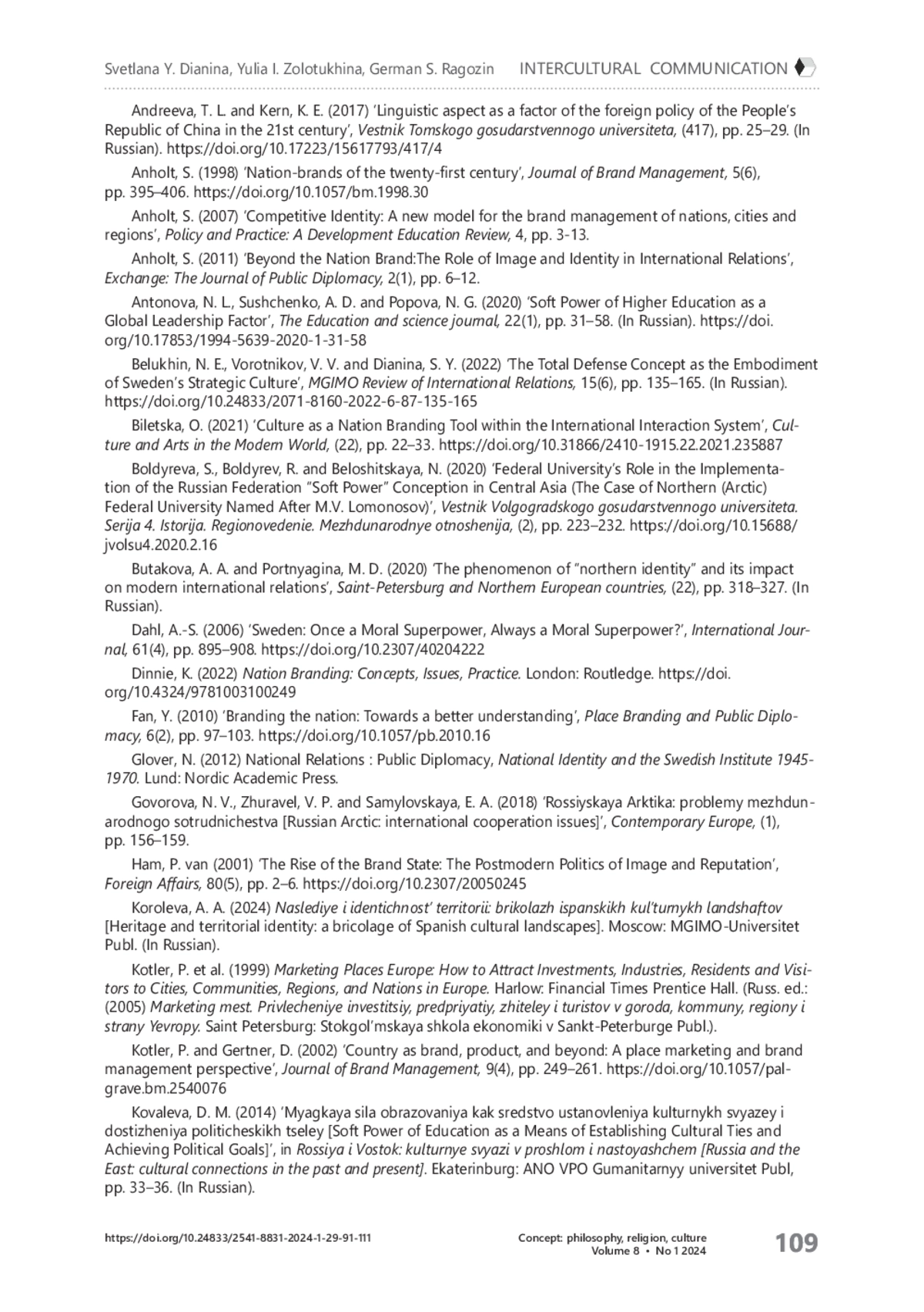 31. Glover N. National Relations: Public Diplomacy, National Identity and the Swedish Institute 1945-1970. - Lund: Nordic Academic Press, 2011. - 290 p.