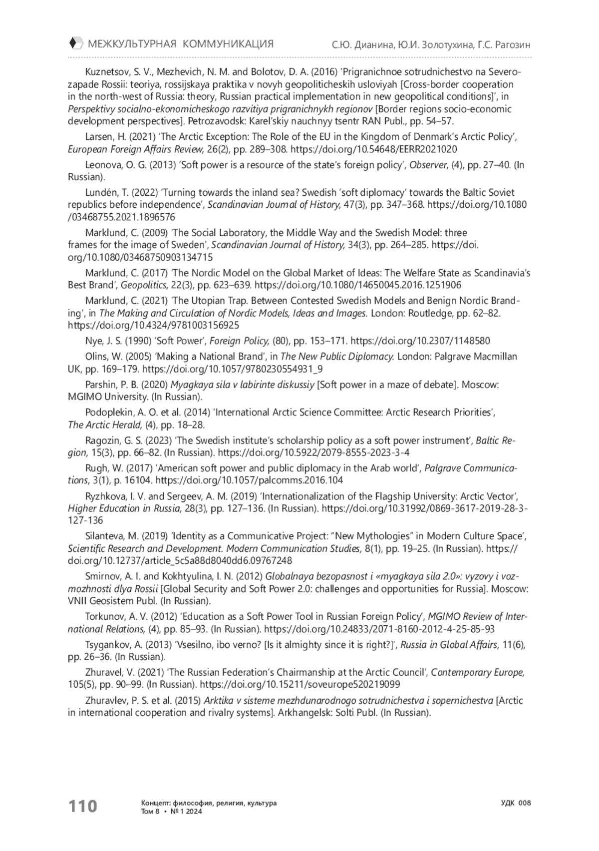 5. Белухин Н.Е., Воротников В.В., Дианина С.Ю. Концепция “тотальной обороны” как отражение стратегической культуры Швеции // Вестник МГИМО-Университета. - 2022. - Т. 15, № 6. - С. 135-165. https://doi.org/10.24833/2071-8160-2022-6-87-135-165