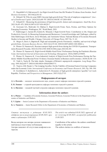 19. Pletnev D., Naumova K.Russian transport high-growth firms during the COVID-19 pandemic // Transportation Research Procedia. 2022. № 63. Р. 2542-2549. DOI: 10.1016/j.trpro.2022.06.293 EDN: QAHKRH