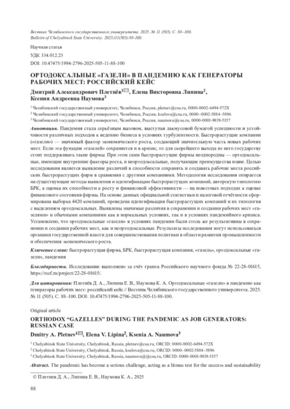 Пандемия стала серьёзным вызовом, выступая лакмусовой бумагой успешности и устойчивости различных подходов к ведению бизнеса в условиях турбулентности. Быстрорастущие компании («газели») значимый фактор экономического роста, создающий значительную часть новых рабочих мест. Если эта функция «газелей» сохраняется и в кризис, то для скорейшего выхода из него государству стоит поддерживать такие фирмы. При этом сами быстрорастущие фирмы неоднородны - ортодоксальные, имеющие внутренние факторы роста, и неортодоксальные, получающие преимущества извне. Целью исследования является выявление различий в способности сохранять и создавать рабочие места российских быстрорастущих фирм в сравнении с другими компаниями. Методология исследования опирается на существующие методы выявления и идентификации быстрорастущих компаний, авторскую типологию БРК, а оценка их способности к росту и финансовой эффективности - на известных подходах к оценке финансового состояния фирмы. На основе данных официальной статистики и налоговой отчётности сформирована выборка 4420 компаний, проведена идентификация быстрорастущих компаний и их типология с выделением ортодоксальных. Выявлены значимые различия в сохранении и создании рабочих мест «газелями» и обычными компаниями как в нормальных условиях, так и в условиях пандемийного кризиса. Установлено, что ортодоксальные «газели» в условиях пандемии были столь же результативны в сохранении и создании рабочих мест, как и неортодоксальные. Результаты исследования могут использоваться органами государственной власти для совершенствования политики в области развития промышленности и обеспечения экономического роста.